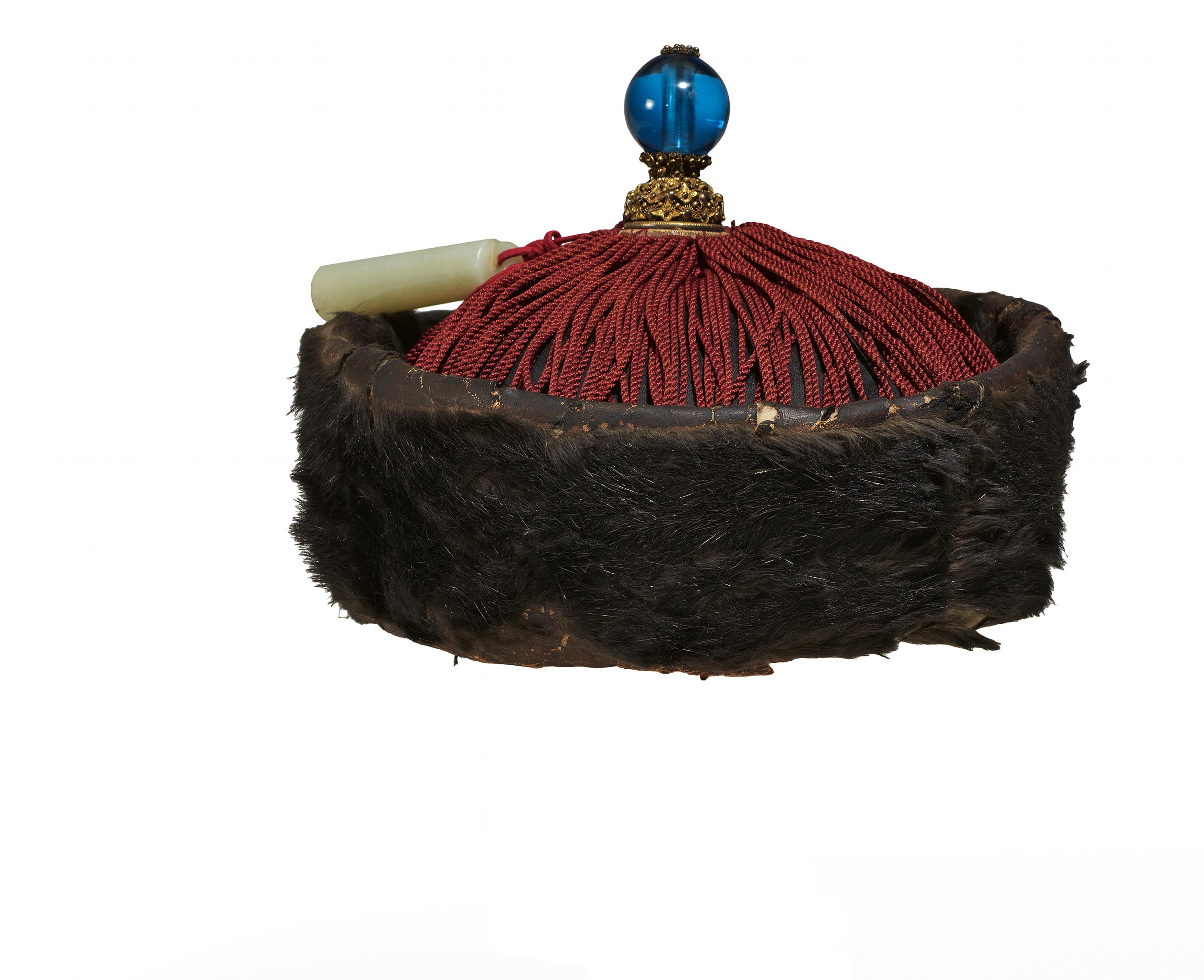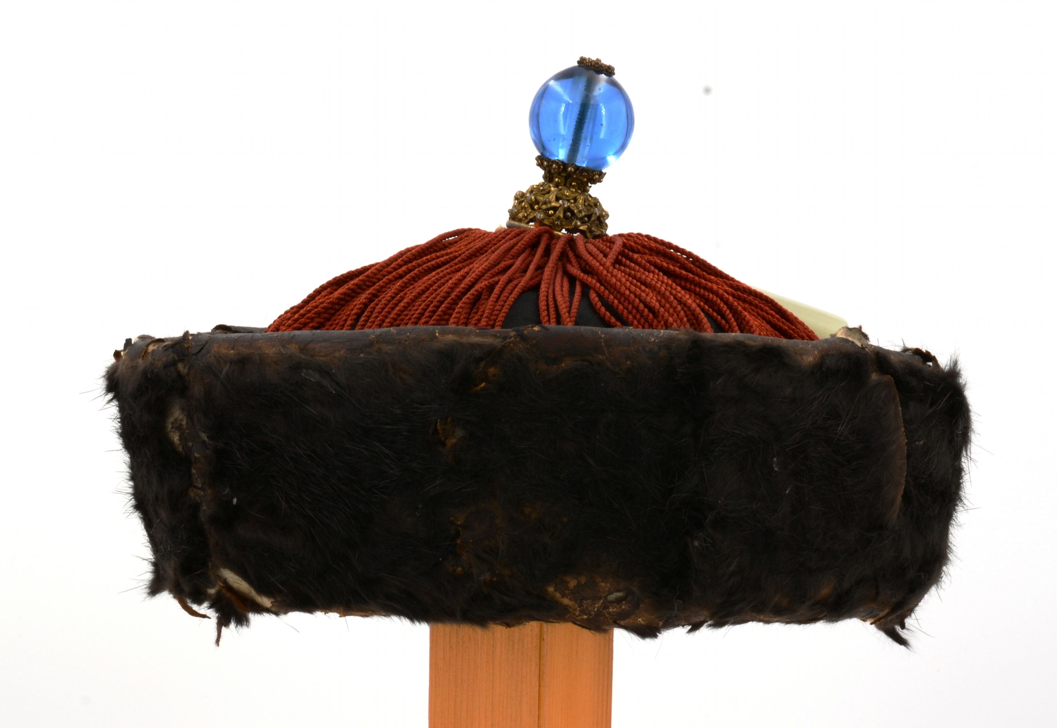 Technik: Dunkles Fell (wohl Nerz), Seiden, Baumwolle, Seidenfransen, Hutknopf aus Silberfiligran, vergoldet und Perle aus blauem Glas, Federhülse aus grüner Jade.