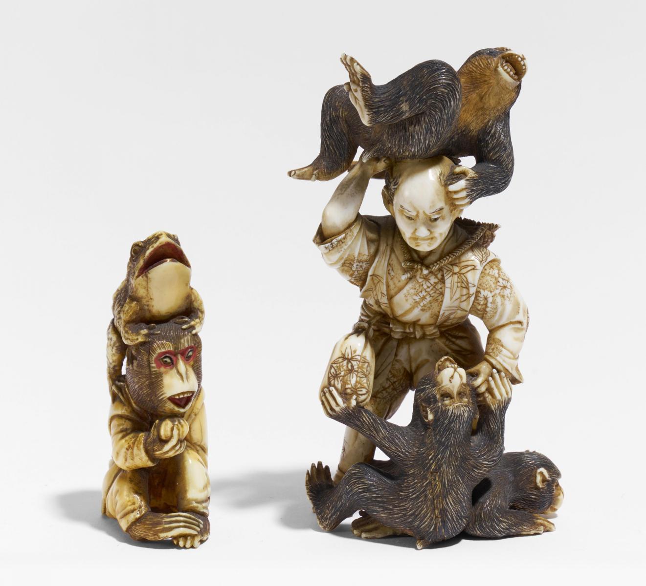 Zustand A/B. Beilage: Okimono eines Affen mit einer Kröte auf dem Kopf. Um 1900. Elfenbein. Höhe 6,2cm. Zustand C.