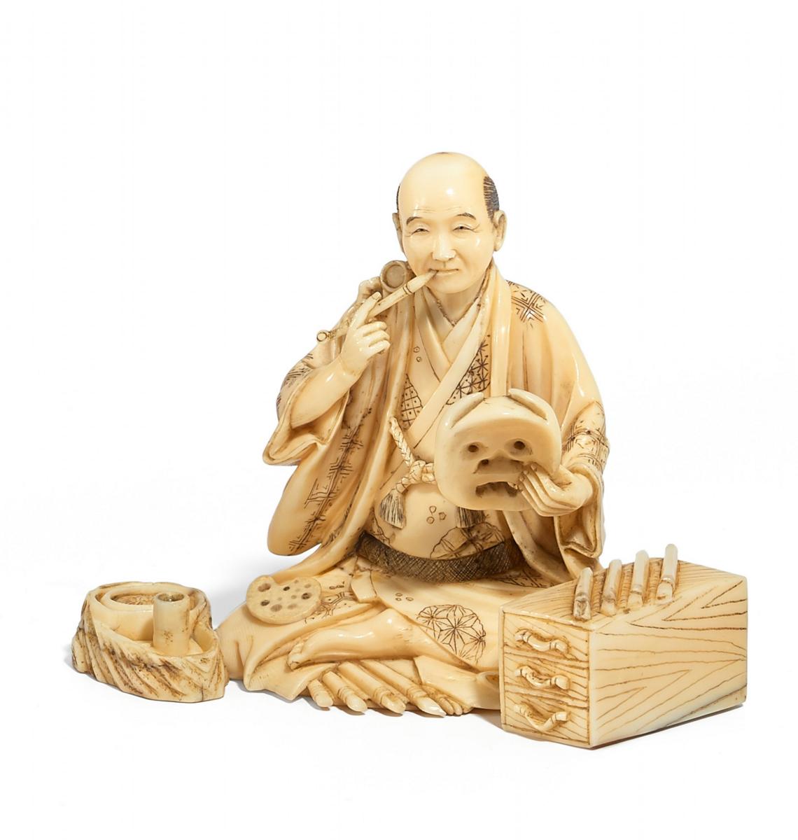 Technik: Elfenbein, sehr fein geschnitzt und graviert, Gewandmuster auf seinem Kimono und Holzmaserung fein graviert und dunkel akzentuiert.