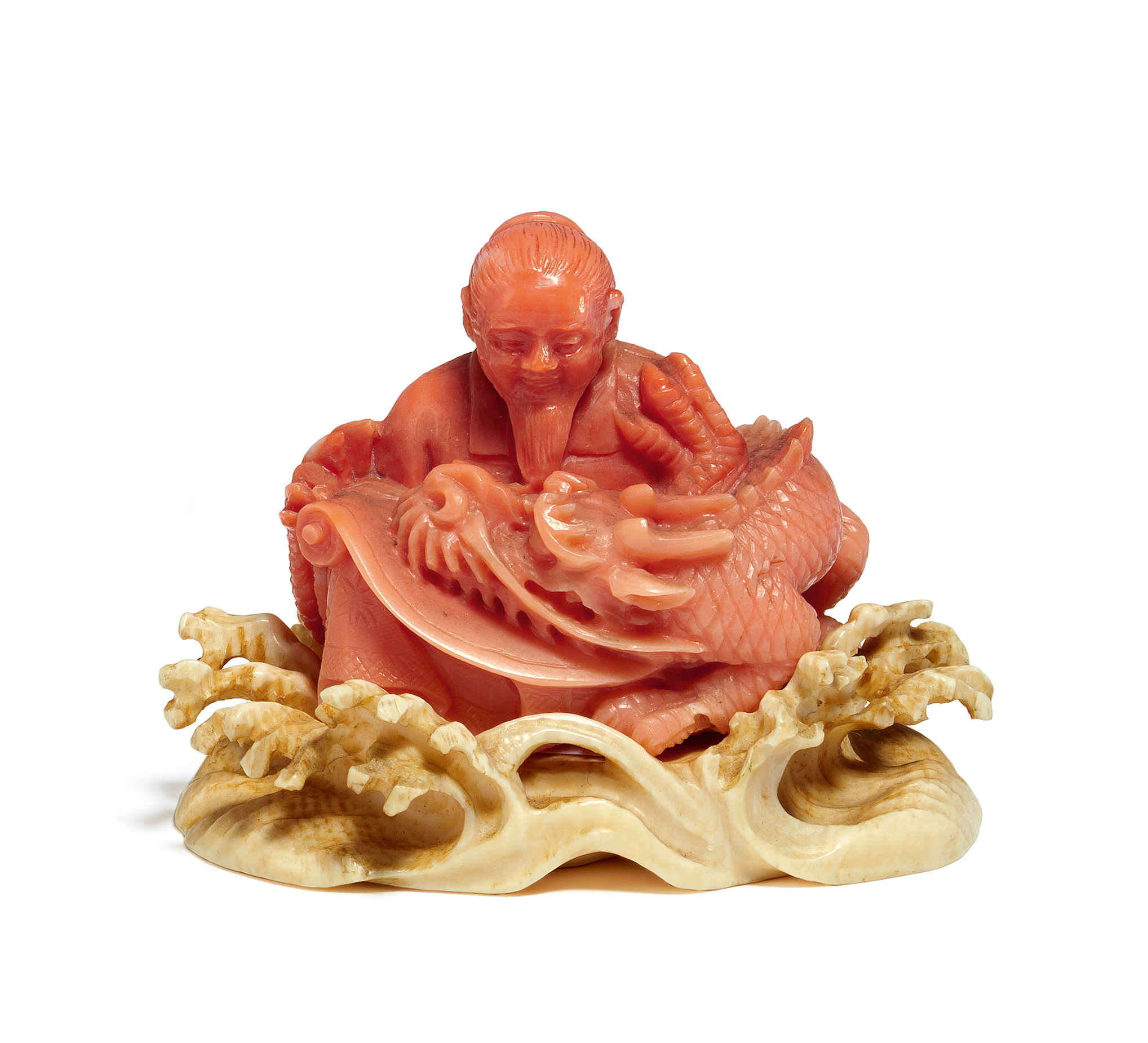 Technik: Koralle überaus fein geschnitzt und graviert. Sockel aus Elfenbein.