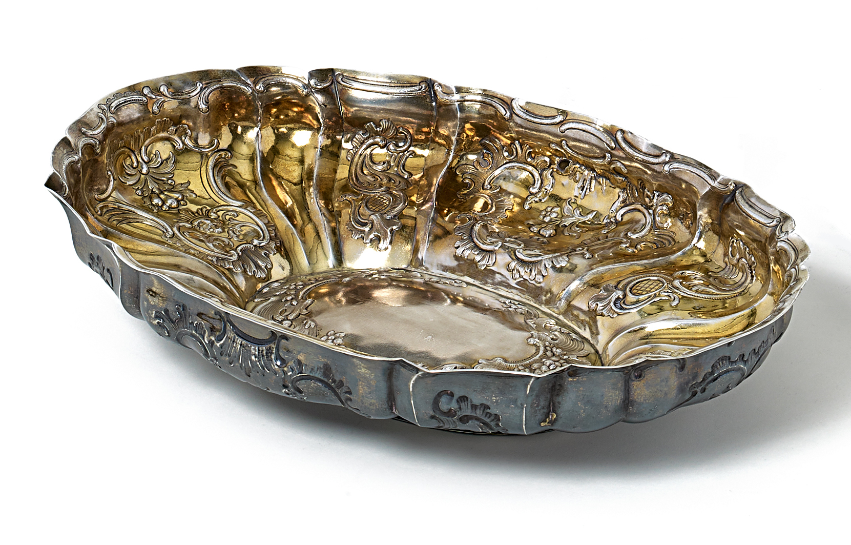 Silber mit Innenvergoldung. Ovale leicht bombierte Form mit getriebenem und graviertem Rocailledekor. Darin männliche