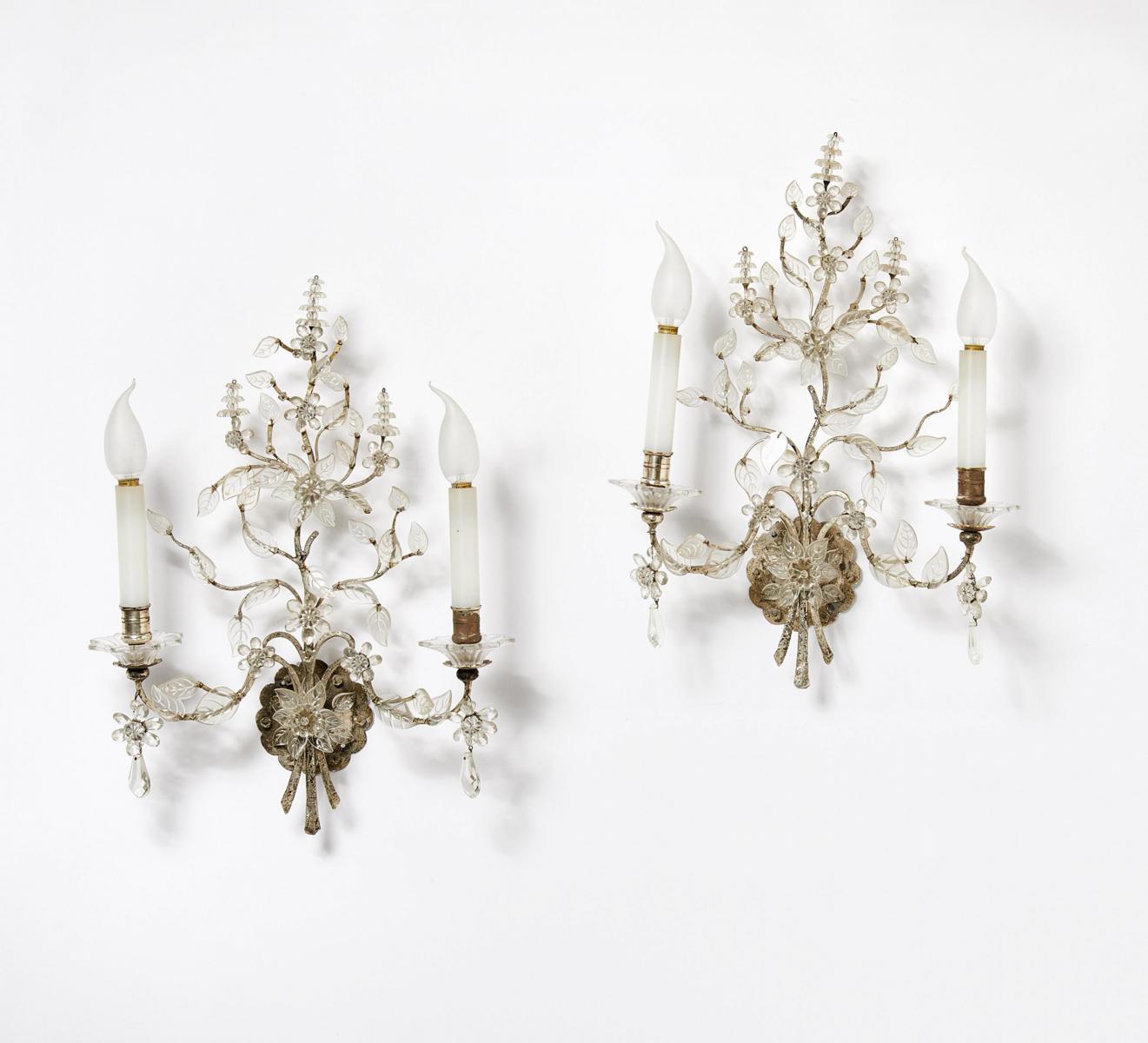 PAAR APPLIKEN MIT FLORALER DEKORATION UND PRISMENBEHANG.