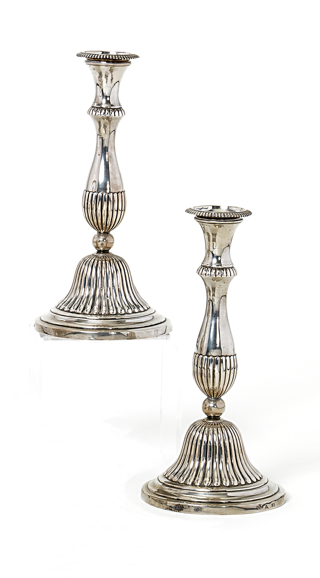 Silber. Glockenfuß mit Balusterschaft. Godronendekor. Ca. 664g. Höhe jeweils 25cm.