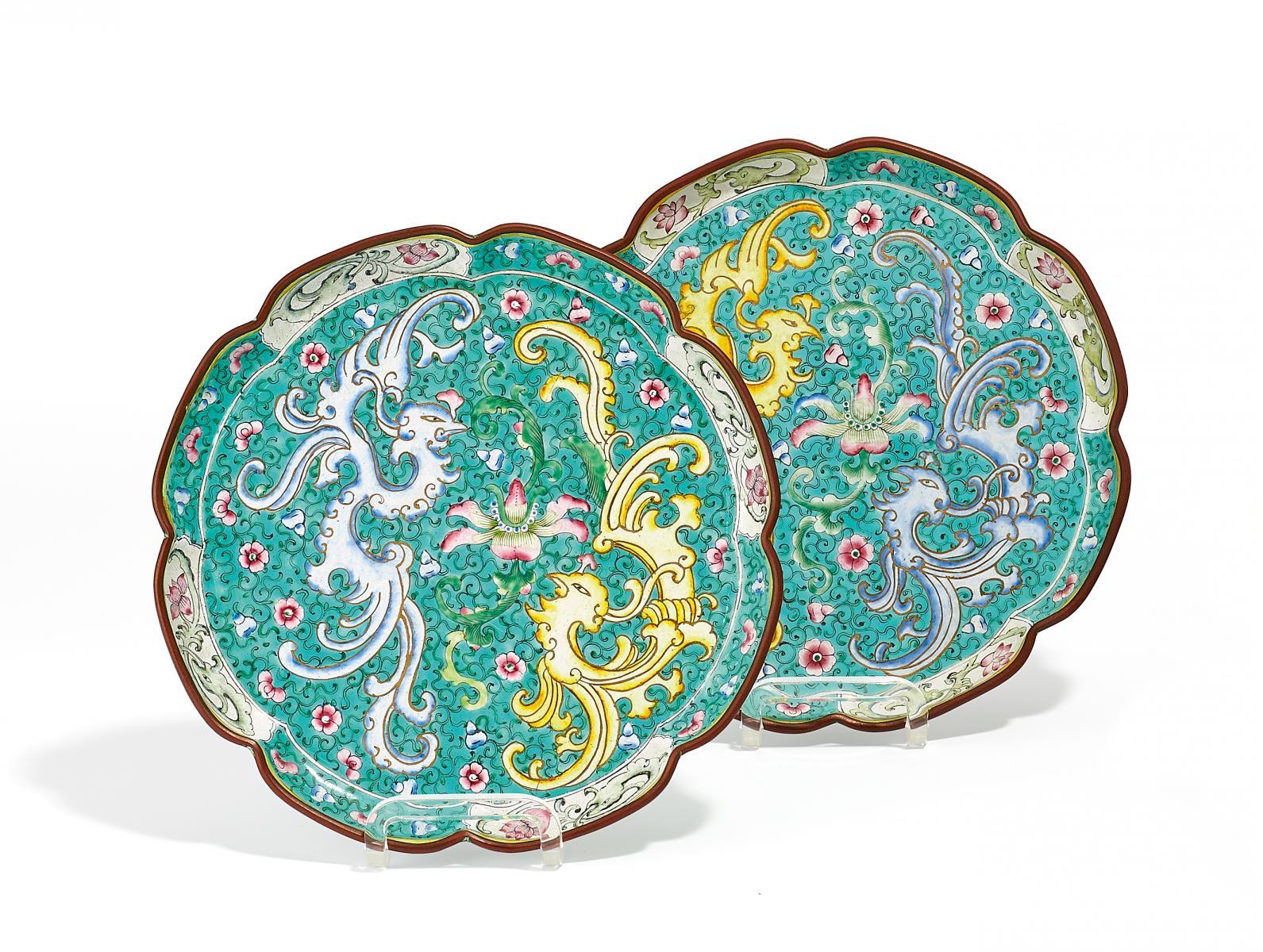 PAAR BLÜTENFÖRMIGE TELLER MIT FENGHUANG-VÖGELN UND LOTOS.