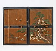 Technik: Paulownia-Holz (kiri) mit Pigmenten. Rahmen und Griffleisten schwarz lackiert. Verschlussbeschläge aus Bronze. Hinten neuere Aufhänger.