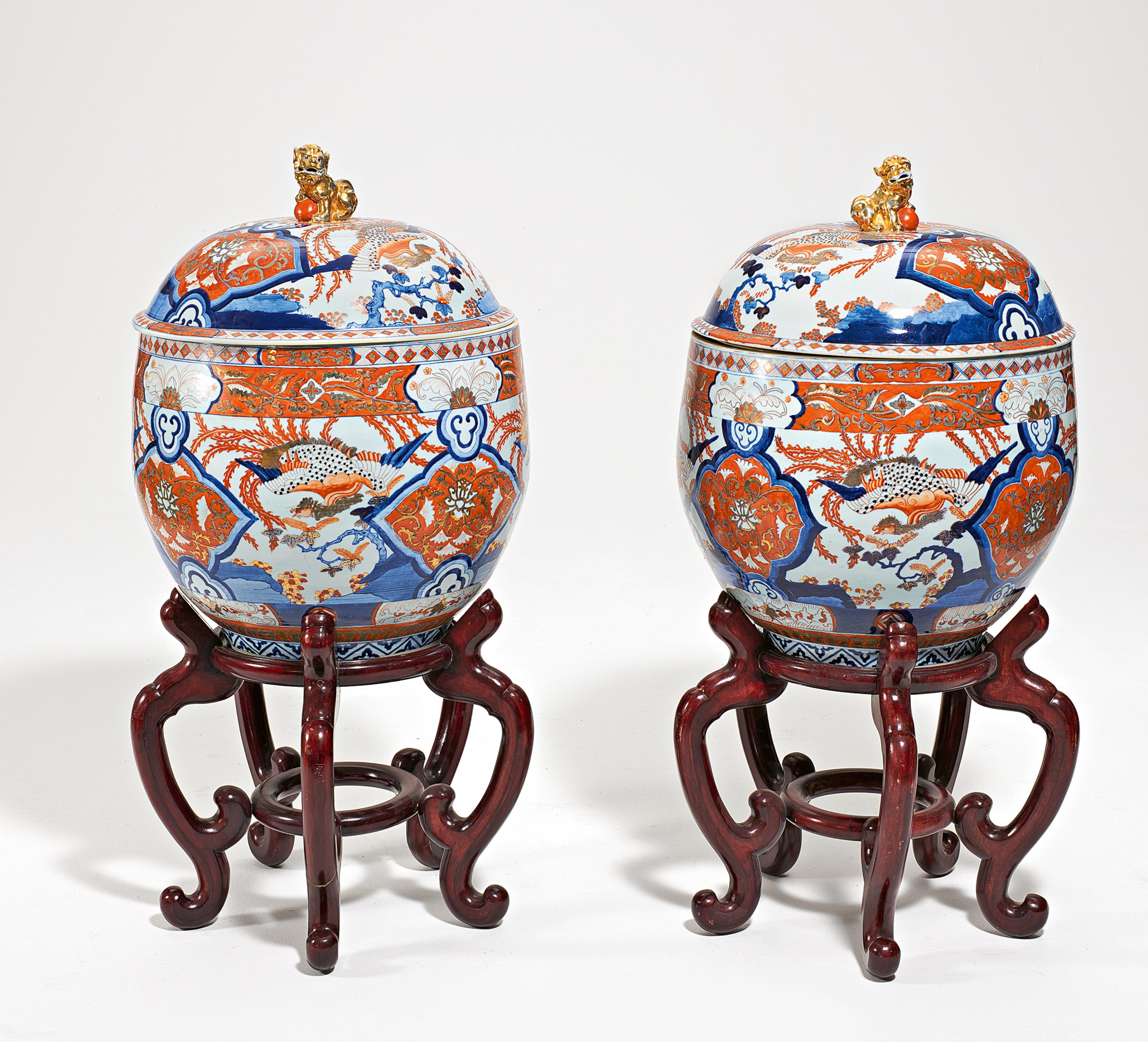 PAAR GROßE IMARI-DECKELGEFÄßE MIT PHÖNIX UND LÖWENKNAUF.
