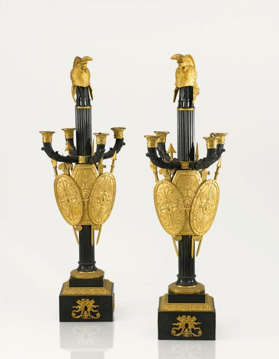 Diese prächtigen Girandolen sind über und über mit Trophäen des Krieges dekoriert. Dies ist wohl als Anspielung auf die ruhmreichen Taten der französischen Kriegsführung und als Symbol der Vormachtstellung in Europa zu sehen.