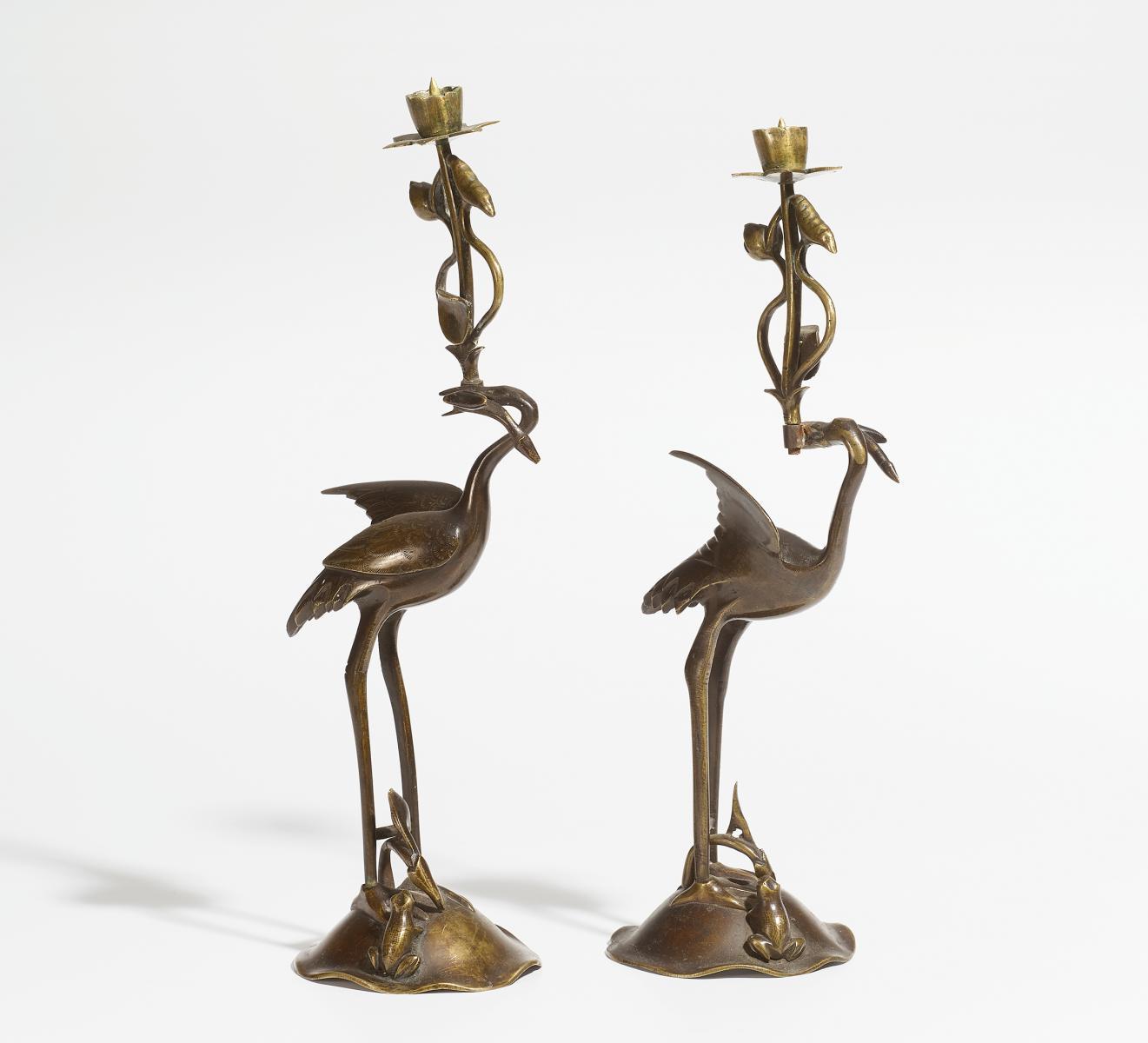 Paar Kerzenleuchter mit Kranich und Frosch.