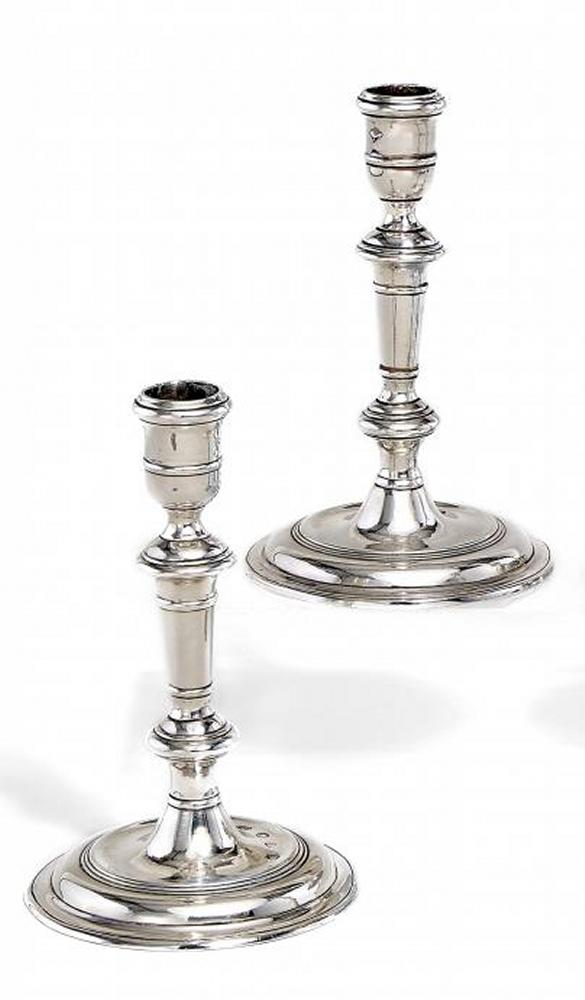 Silber. Mehrfach gestufter Rundfuß mit konkaver Oberseite. Schlanker Balusterschaft mit