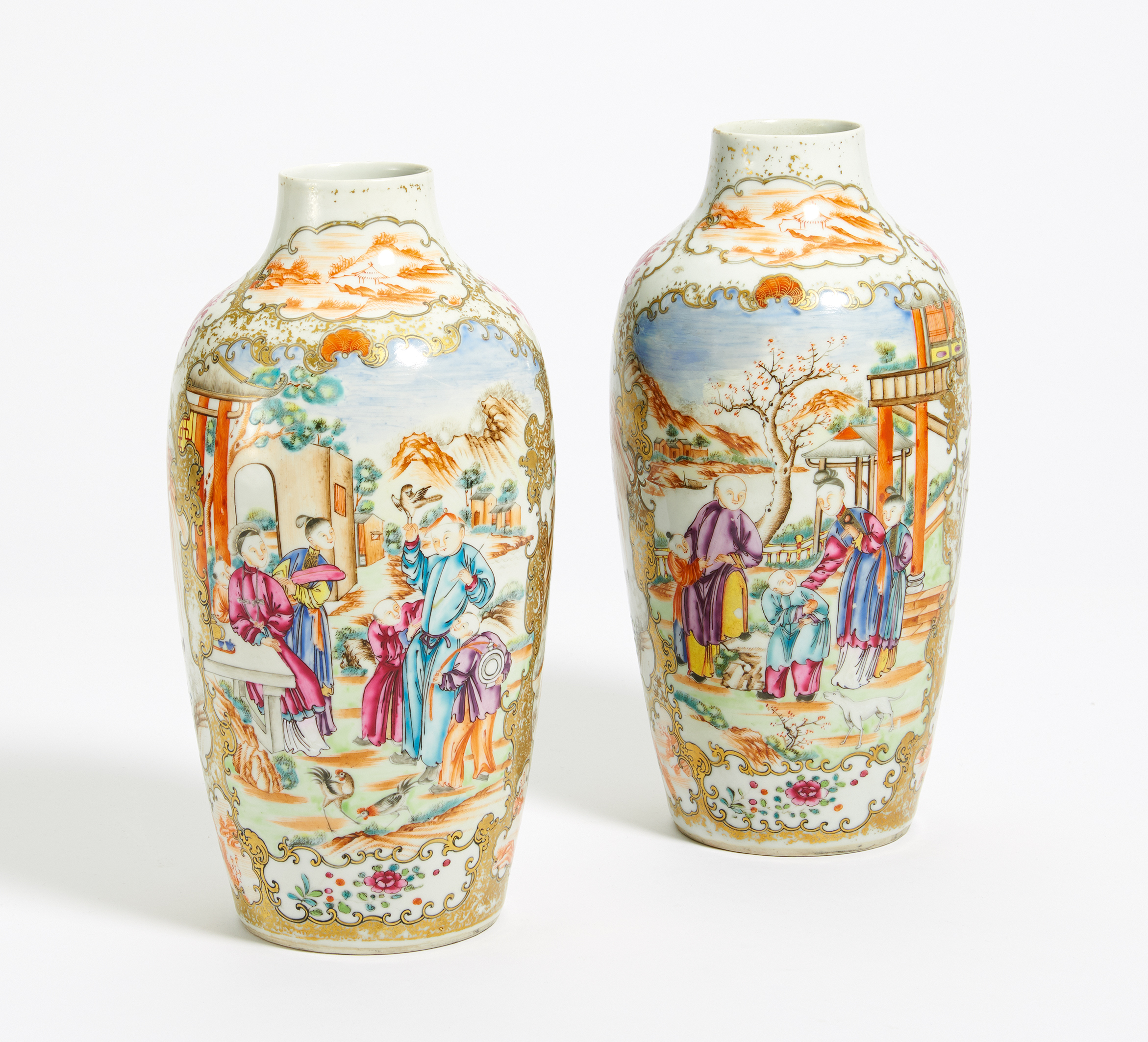 PAAR LATERNENVASEN MIT MANDSCHURISCHEN FAMILIEN IN GARTENLANDSCHAFT.