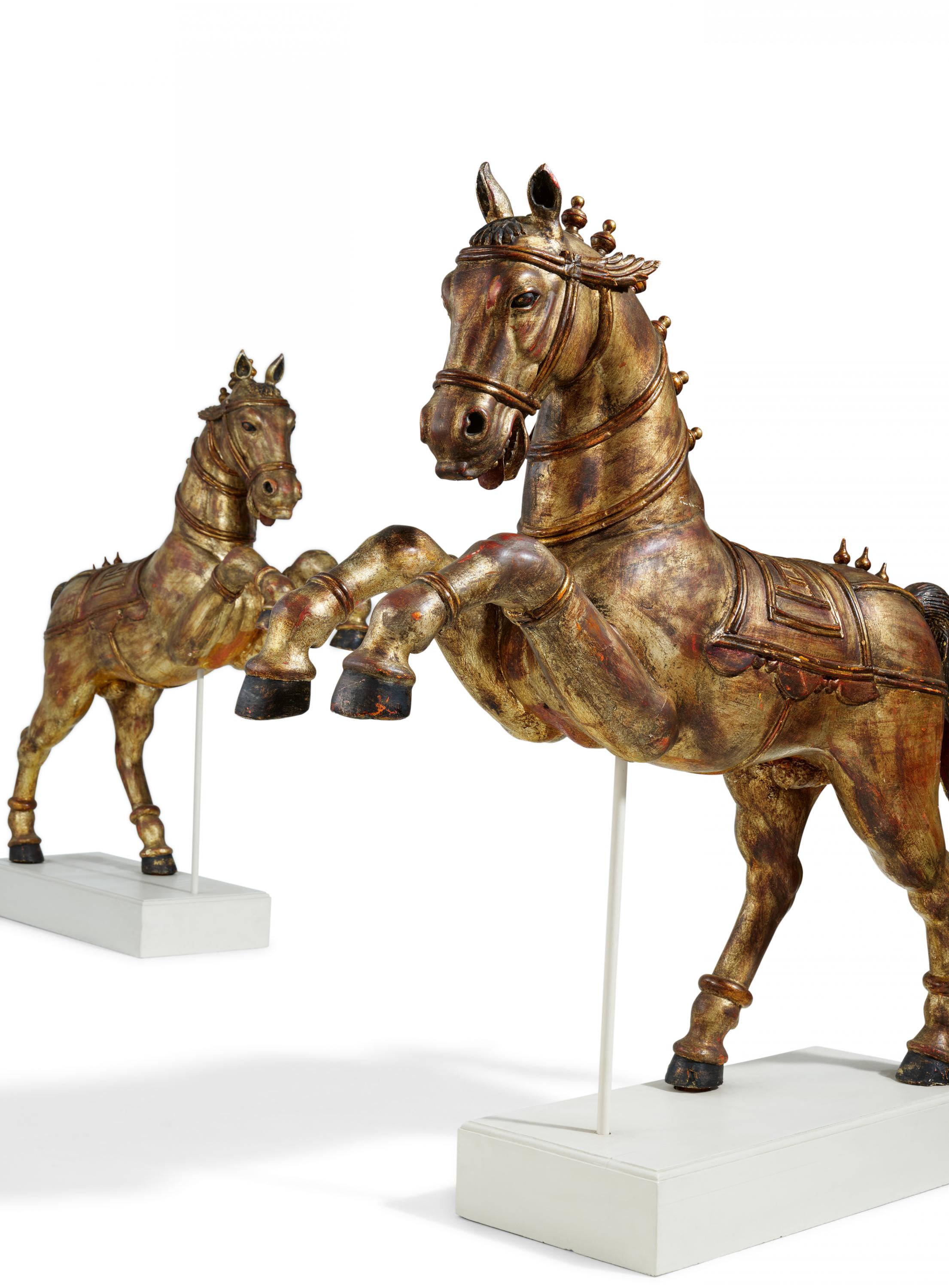 Technik: Holz geschnitzt und vergoldet. Jeweils auf Sockel montiert.