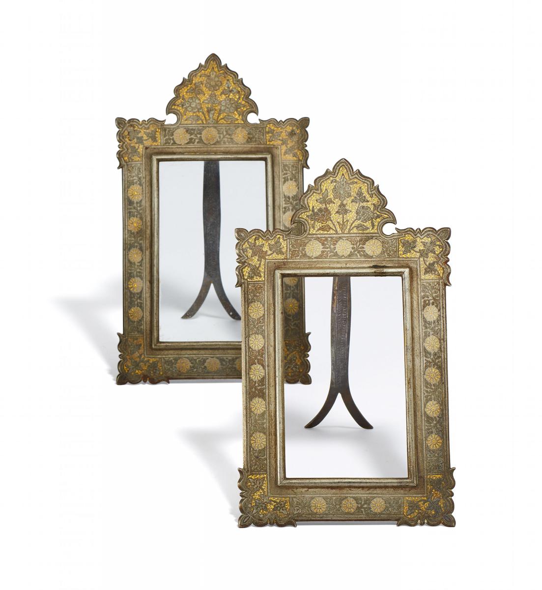 Technik: Koftgari. Eisen mit Einlagen aus Silber und Gold. Rückwärtig mit Aufsteller.