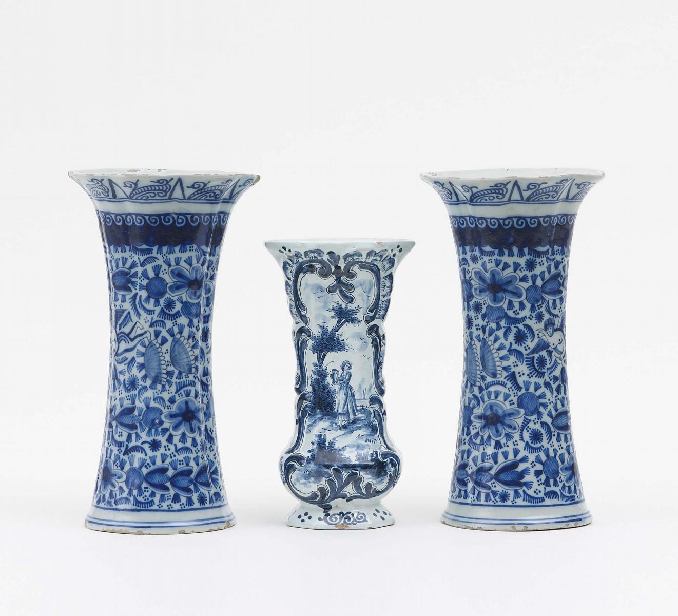 Sandfarbener Scherben, weiß glasiert, blaues Dekor. H.27 cm.