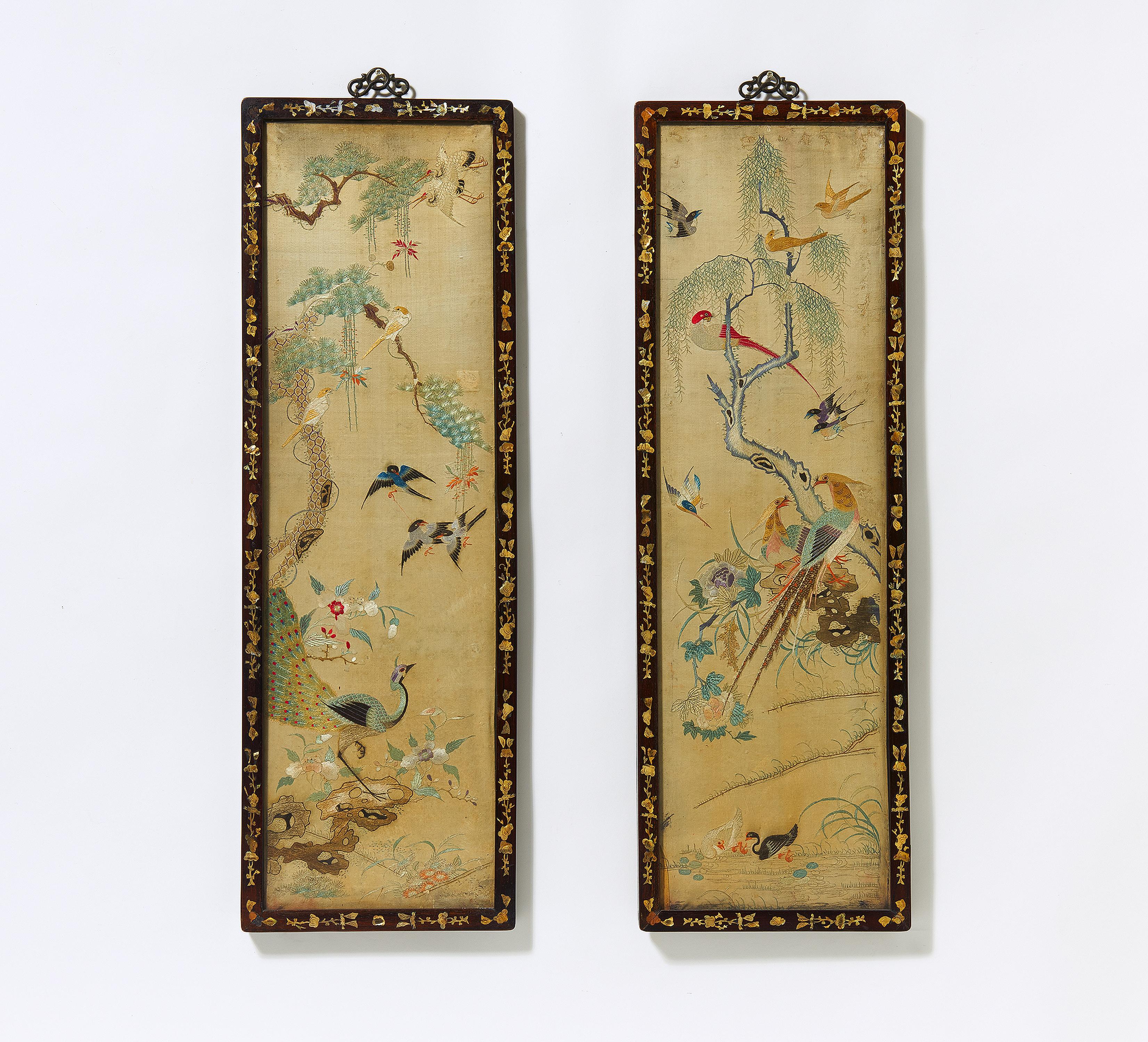 Technik: Seidensatin bestickt mit farbiger Seide in Plattstich.
