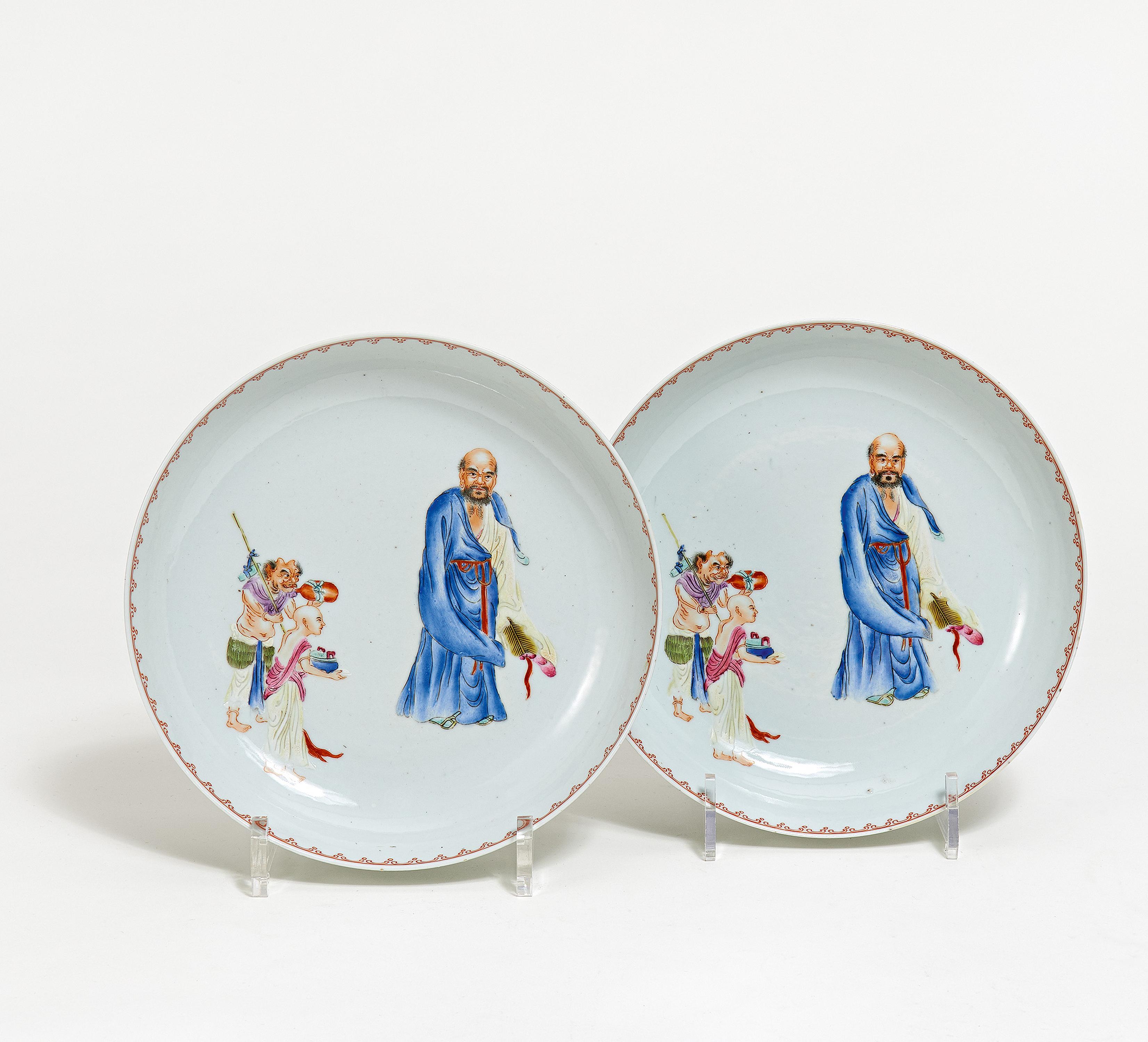PAAR TIEFE TELLER MIT UNSTERBLICHEM UND ZWEI JUNGEN BEGLEITERN.