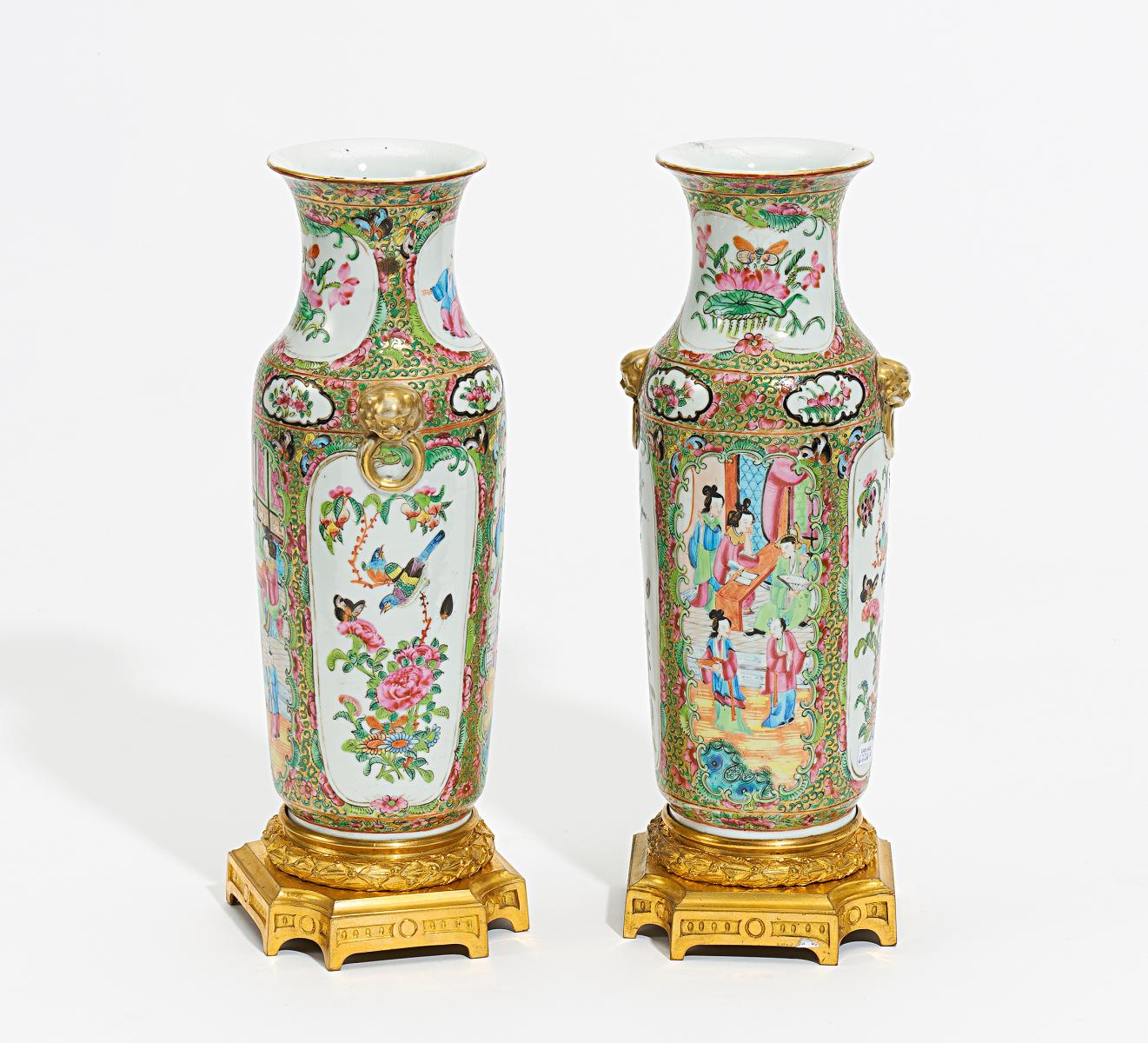 Technik: Porzellan, Mandarin famille rose. Westliche Metallmontierung vergoldet.