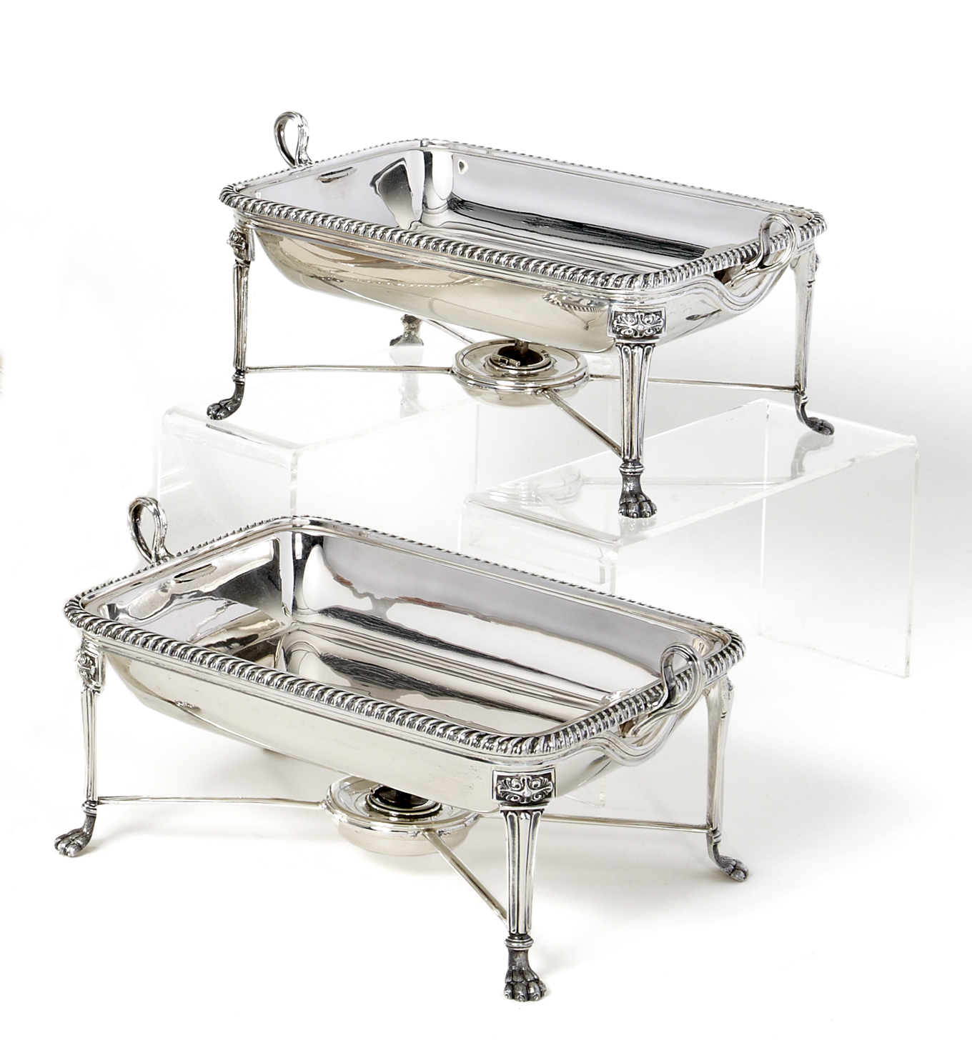 Silber. Rechaud mit Brenner auf vier hohen Tatzenfüßen. Rechteckige Schale mit seitlichen