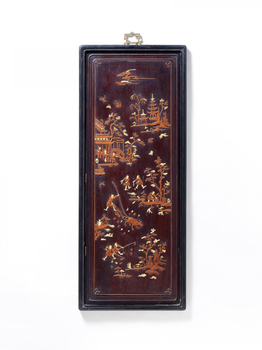 Technik: Hartholz mit Einlagen aus Bambus und Bein in flachem Relief.