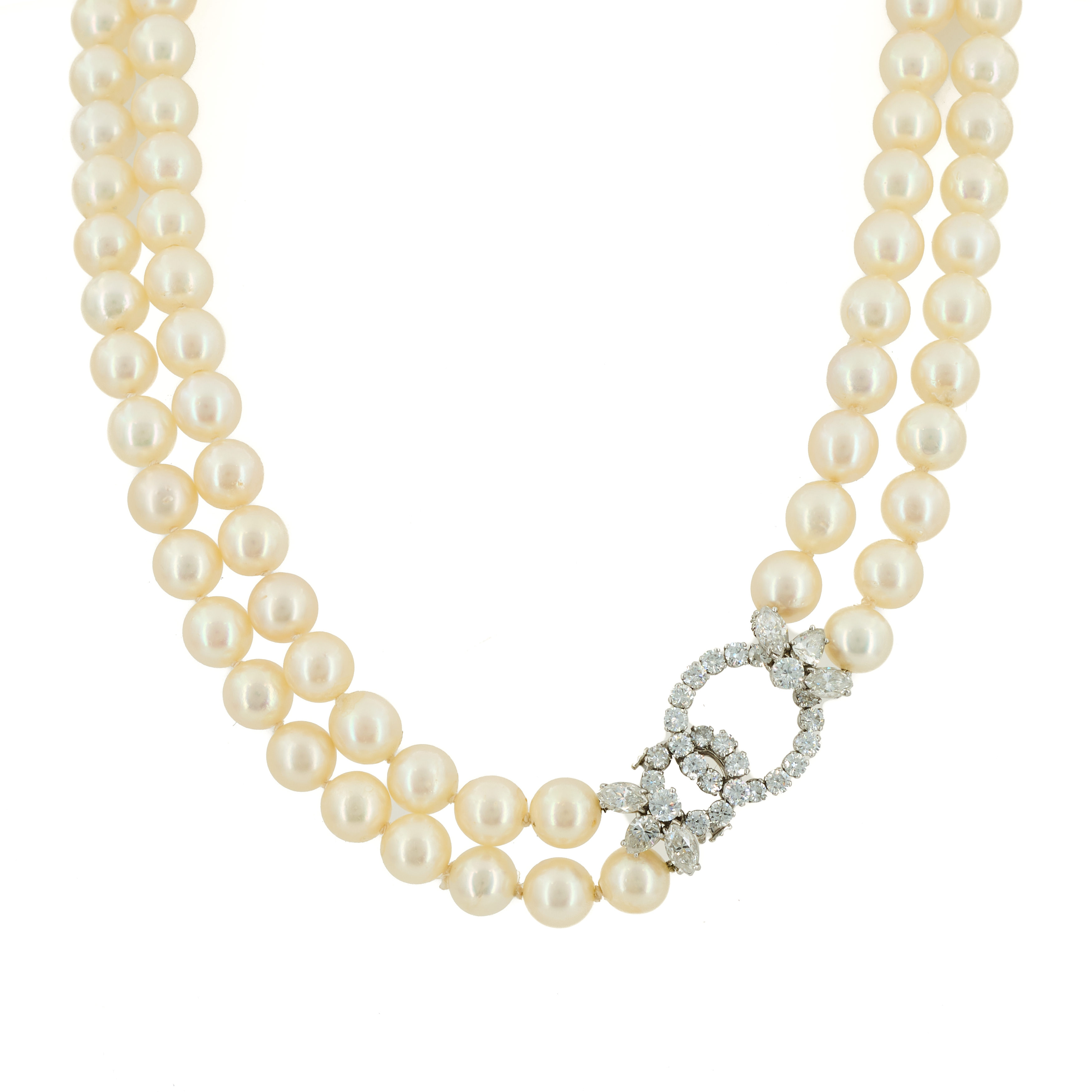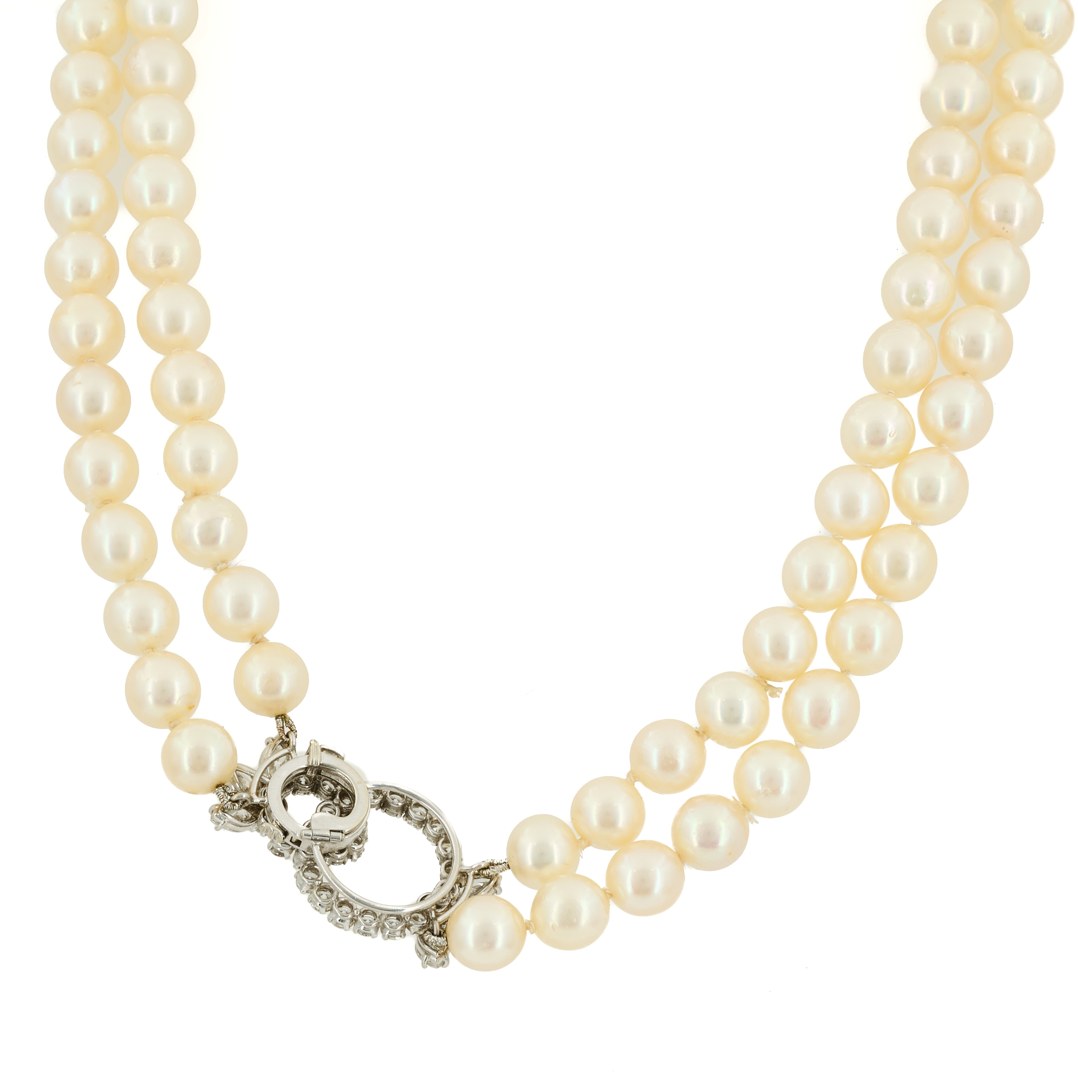 Beschreibung: Zweireihige Akoya-Zuchtperlenkette mit aufwendig gearbeiteter Diamant-Schließe und einem raffiniert konstruierten Verschlusssystem.
