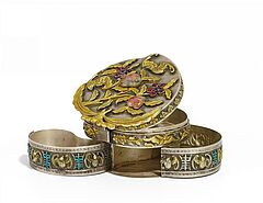 Technik: Silber, teils vergoldet, mit transparentem türkisfarbenem Email und Steinbesatz.