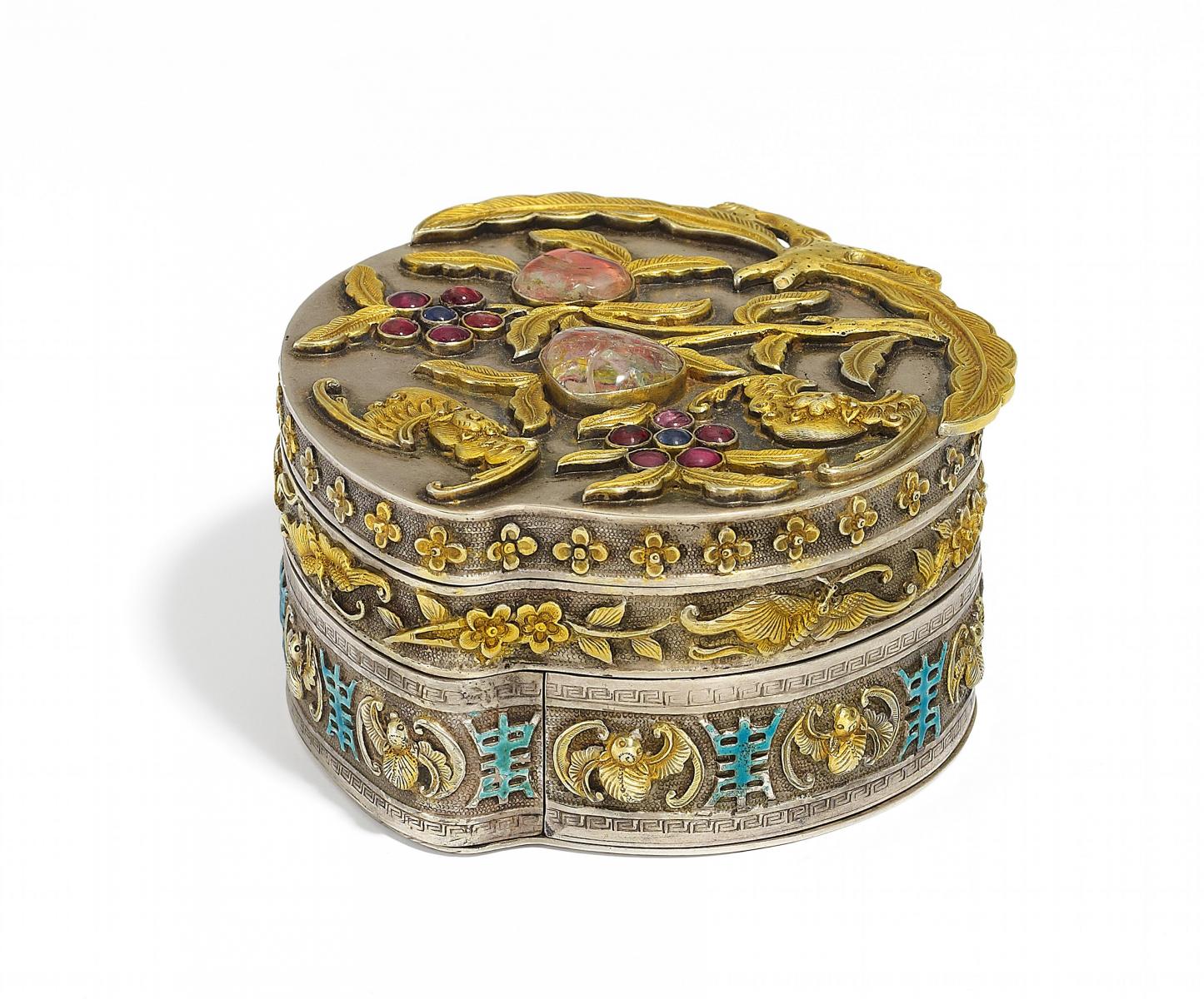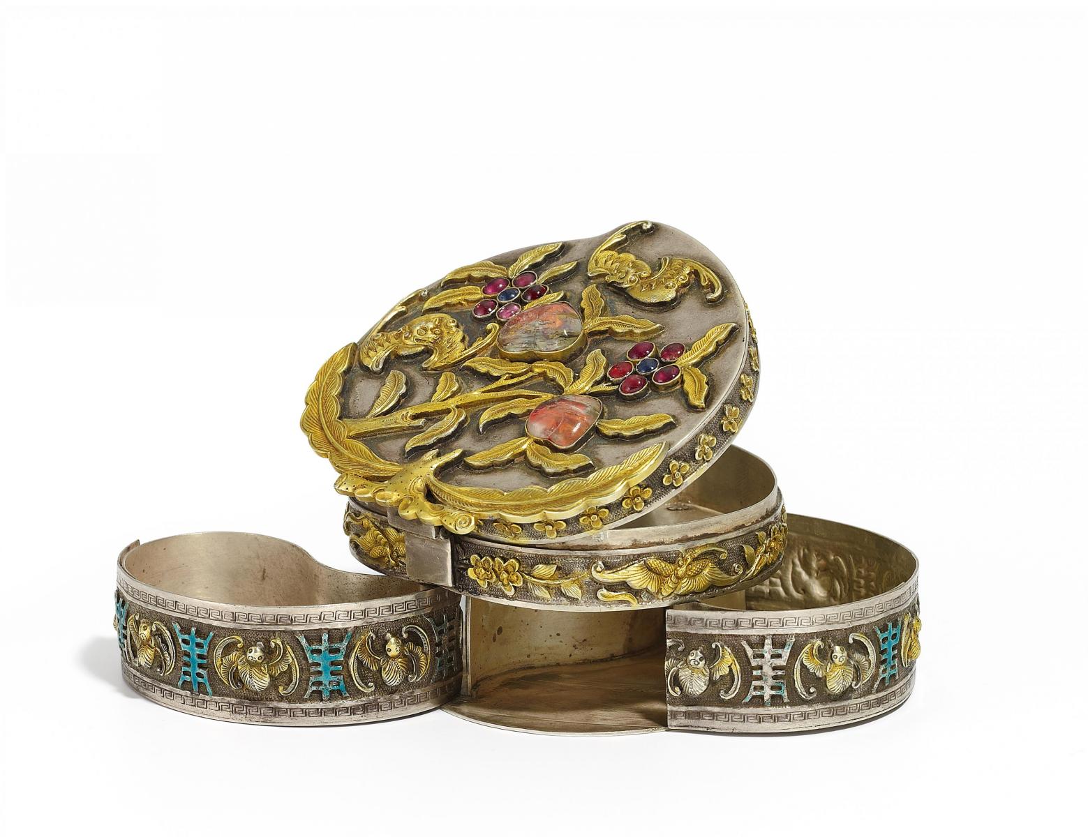 Beschreibung: Ein oberes flaches Kompartiment mit Klappdeckel, unten zwei tiefere Abteilungen zum Herausdrehen. Auf dem Deckel Blätterzweige mit Blüten und Pfirsichen mit Steinbesatz, dazu zwei Fledermäuse. Auf der Wandung Bordüren mit Blüten, Fledermäusen und dem Schriftzeichen für Langes Leben.