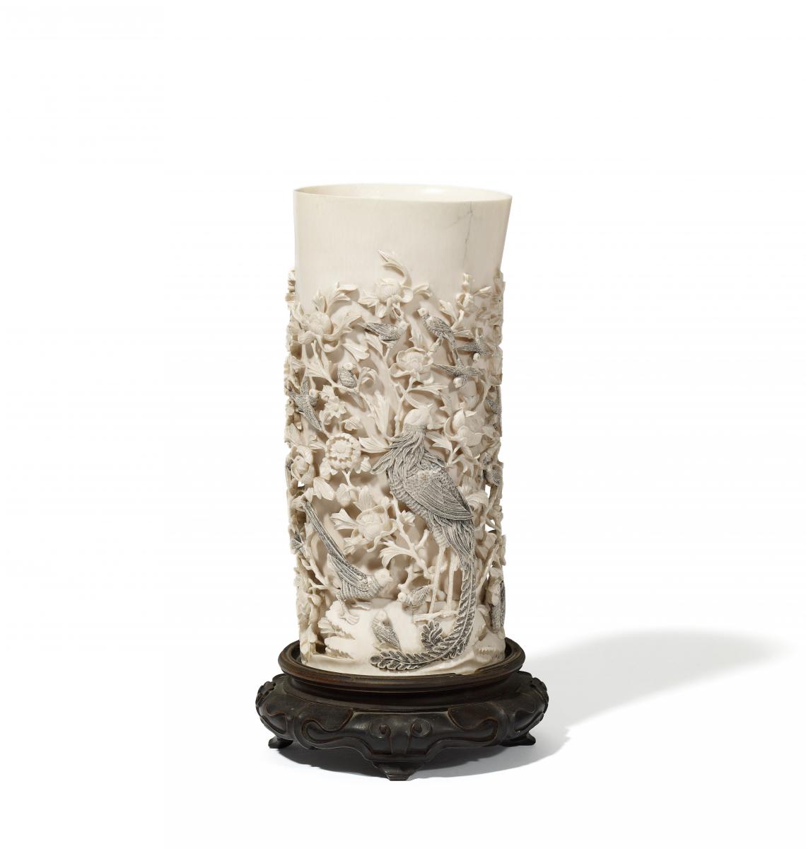 PINSELBECHER MIT DEN 'HUNDERT VÖGELN, DIE DEN PHÖNIX BEWUNDERN'. ELFENBEIN.