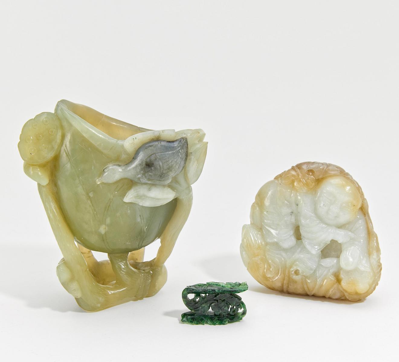 Zustand A/B. Beilage: Knabe auf einem Lotusblatt. Jade. China. 8 x 7,3cm.