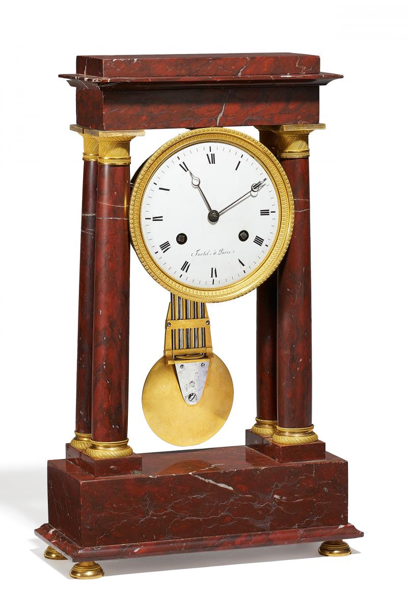 Roter Marmor mit vergoldeten Bronzeapplikationen. Emailzifferblatt. In Form eines Portikus. Römische Ziffern. Großes Pendulewerk mit Federaufhängung,