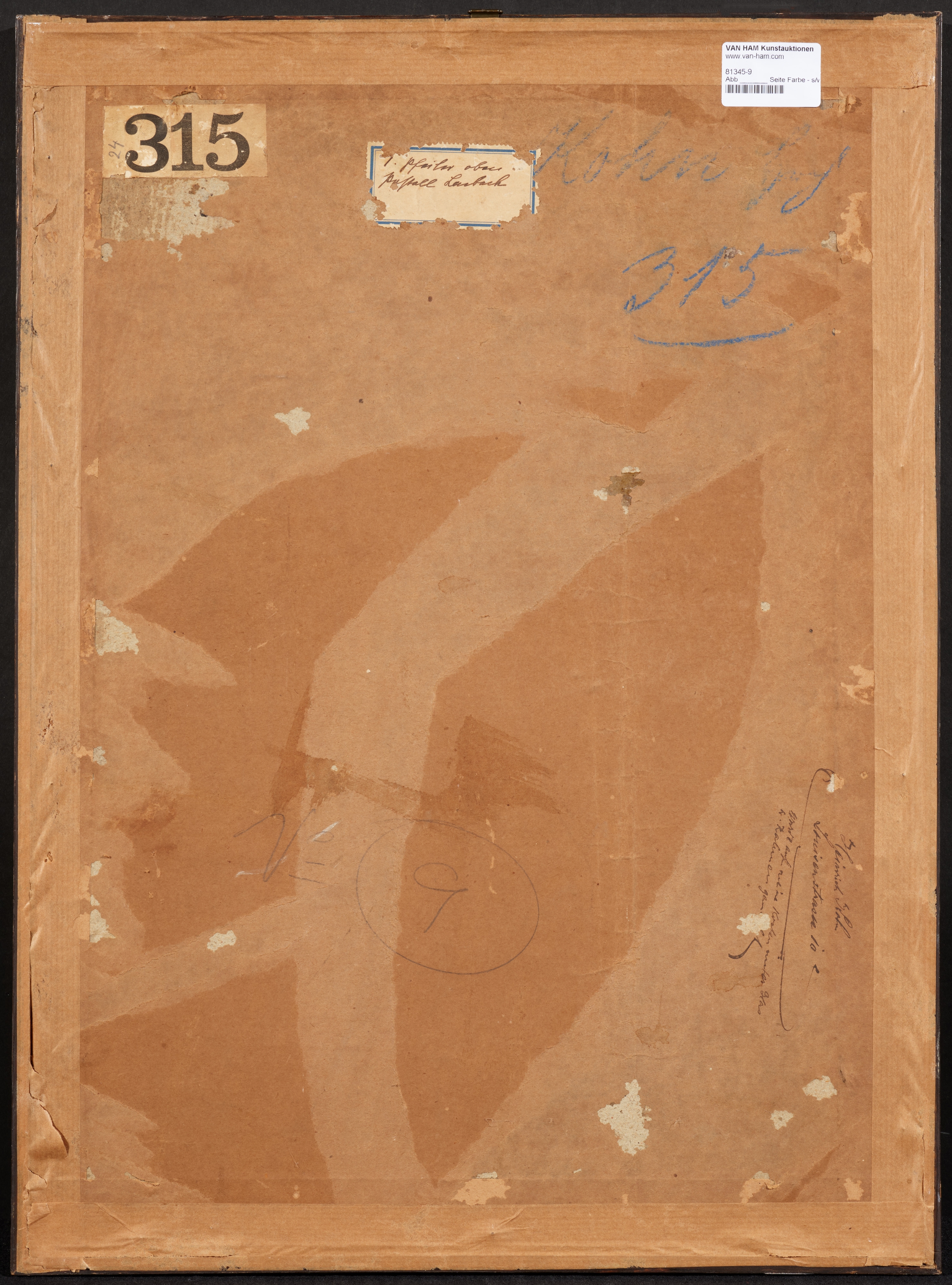 Rückseitige handschriftliche Angaben eines ehemaligen Besitzers sowie altem Etikett mit Werkangaben..