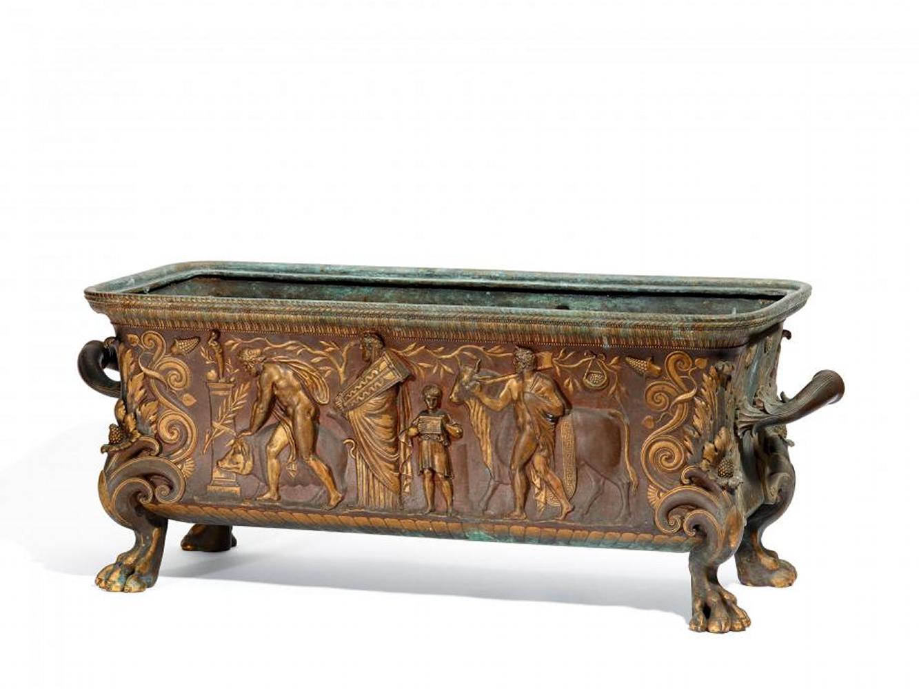Bronze patiniert und tlw. vergoldet. Rechteckige Wanne auf Löwentatzen. Seitliche Griffe. Auf der Wandung antikisierendes Fries