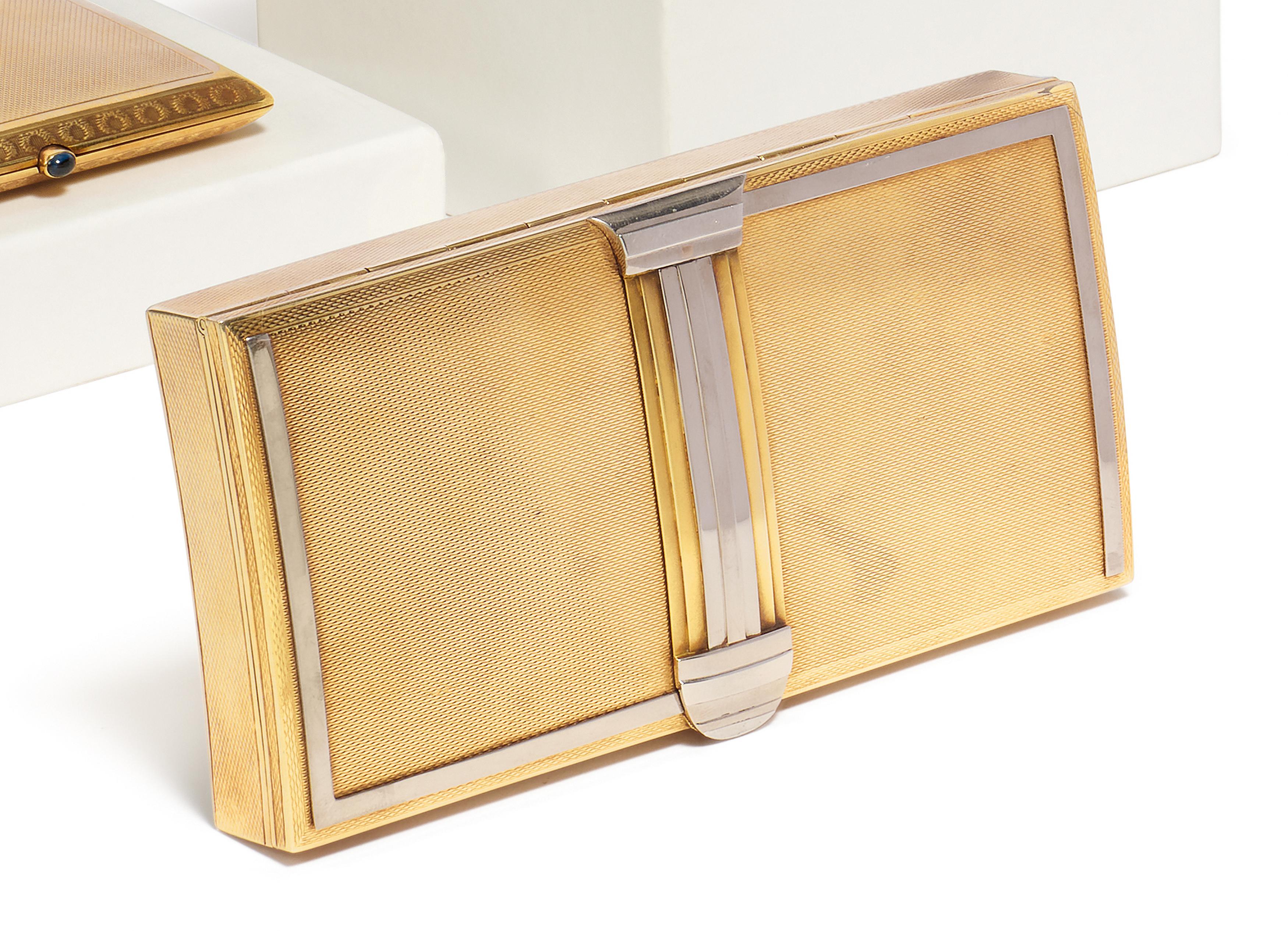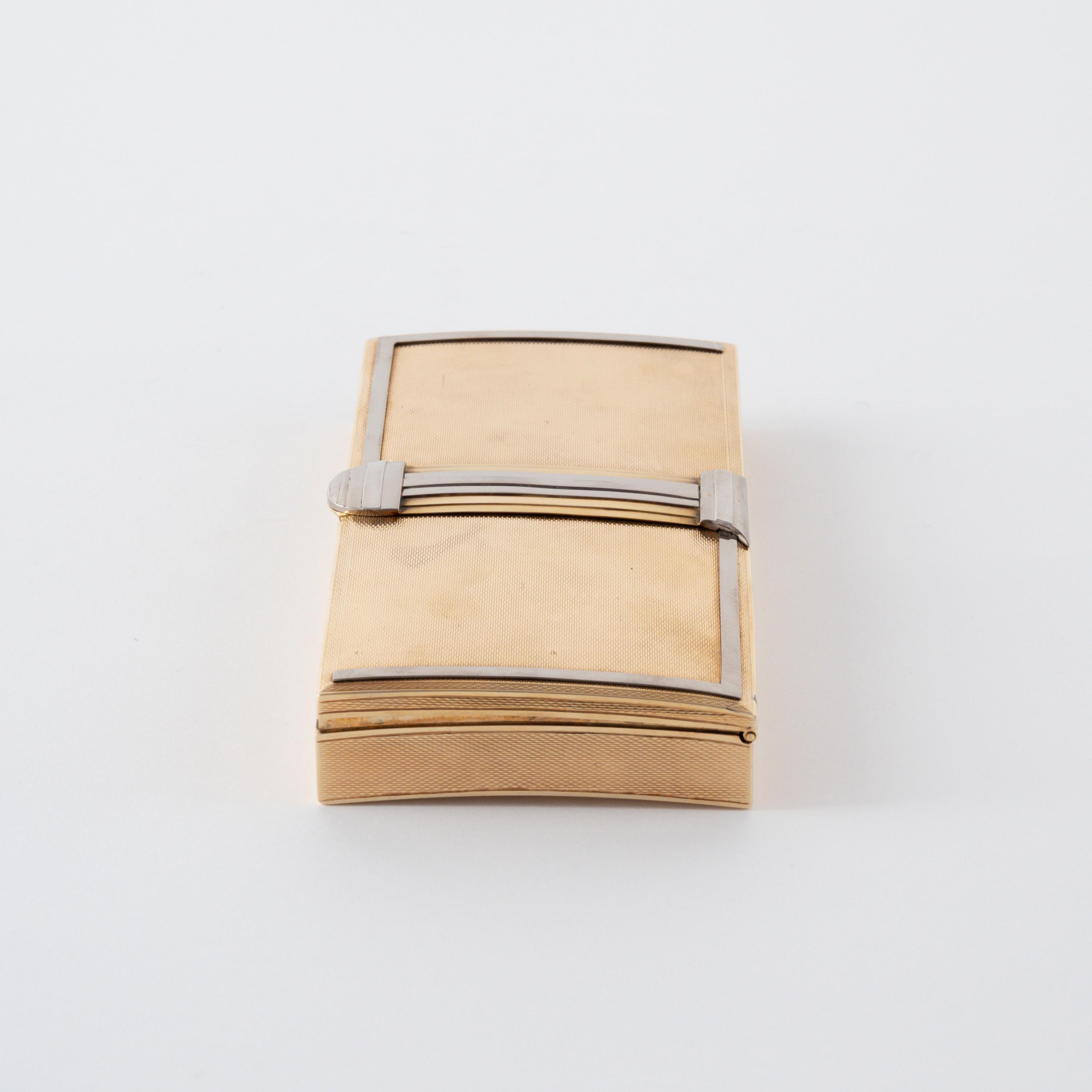 Beschreibung: Rechteckige Form mit leicht gewölbtem Boden und Deckel. Die Oberfläche guillochiert mit