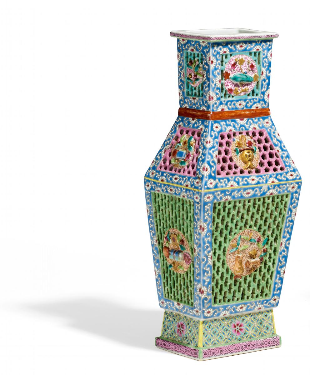 Technik: Longlong-Porzellan bemalt in Aufglasurfarben und Gold. Die äußere Schicht durchbrochen gearbeitet und mit Auflagen in Relief.