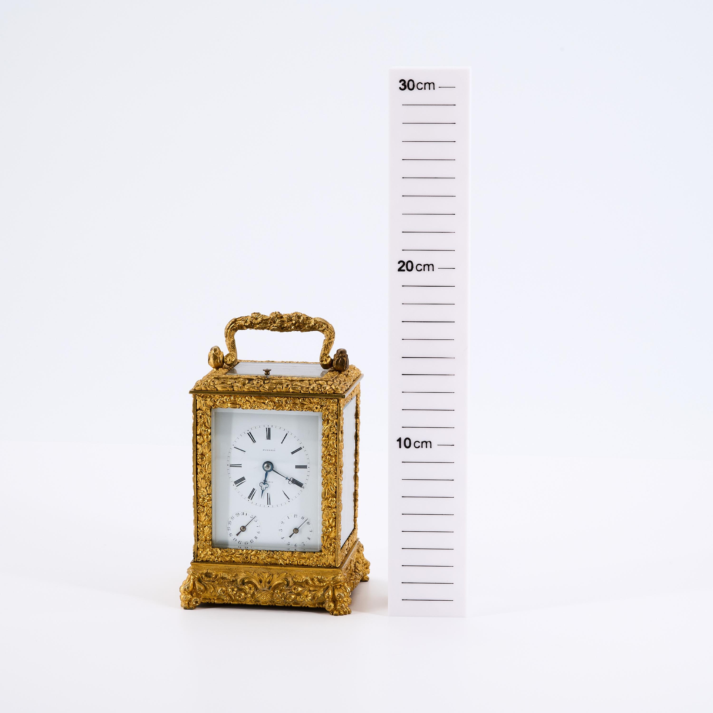 Emailzifferblatt mit römischen Stunden, zwei Hilfszifferblätter für Wecker und Datumsanzeige. Ankerhemmung, Repetition, Halbstunden-Selbstschlag sowie Alarm auf Glocke. .
