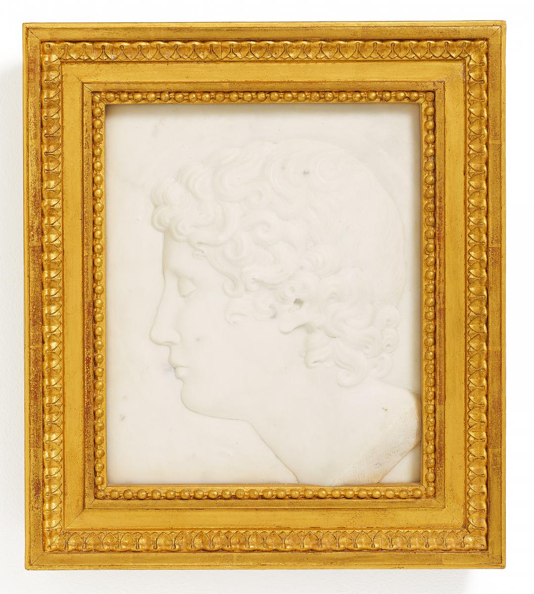 Weißer Marmor. Ca. 29x24 cm. Zustand A/B. Vergoldeter Rahmen.