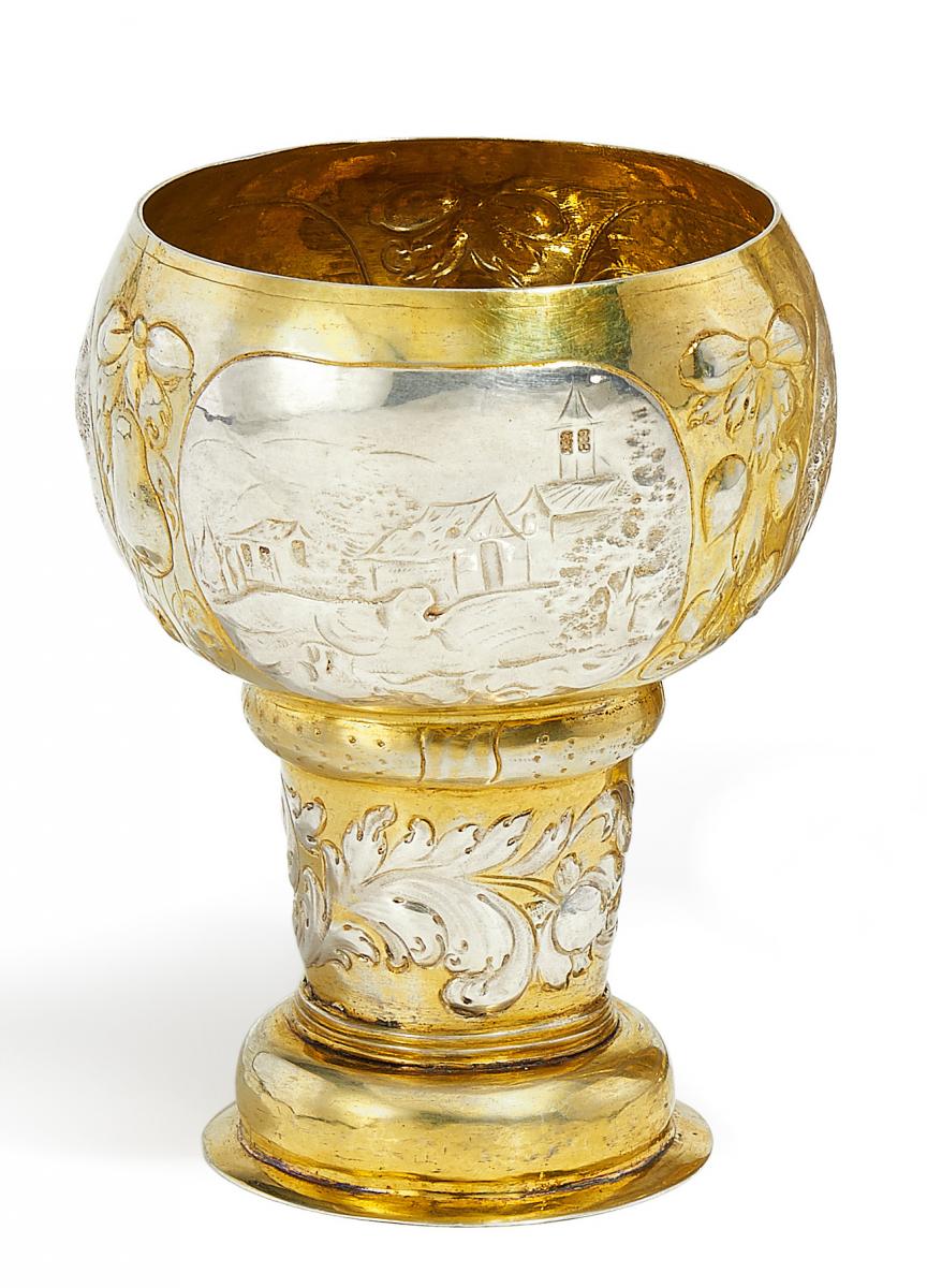 Silber mit Teilvergoldung und Innenvergoldung. Gewölbter Rundfuß darauf zylindrischer Schaft mit Rankendekor. Auf der Kuppa drei