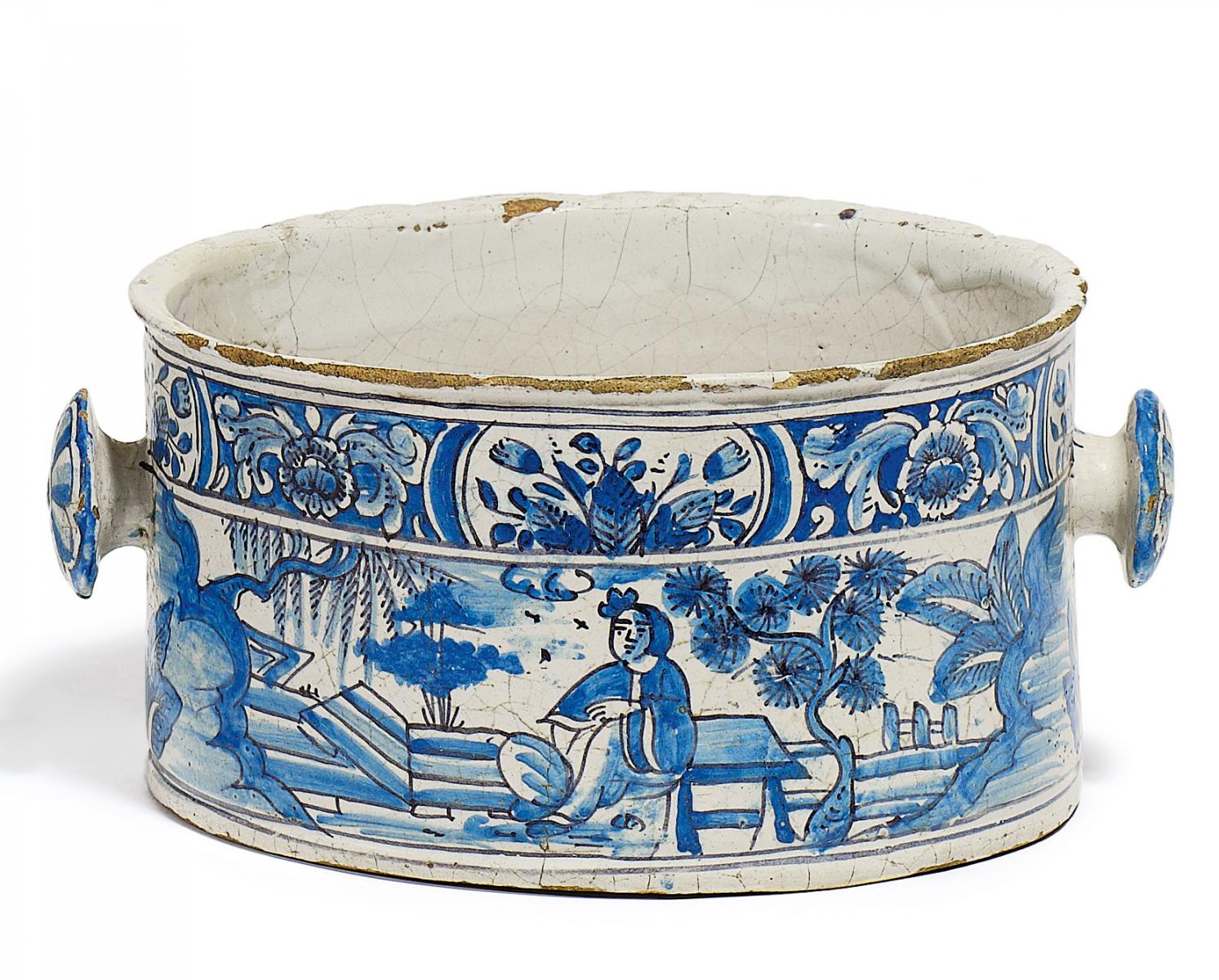 Rötlicher Scherben mit hellgrauer Glasur und blauem Dekor. Höhe 9,5 cm, ø 17cm. Marke auf der Bodenunterseite JO. E h18. JahrhundertZustand B/C.