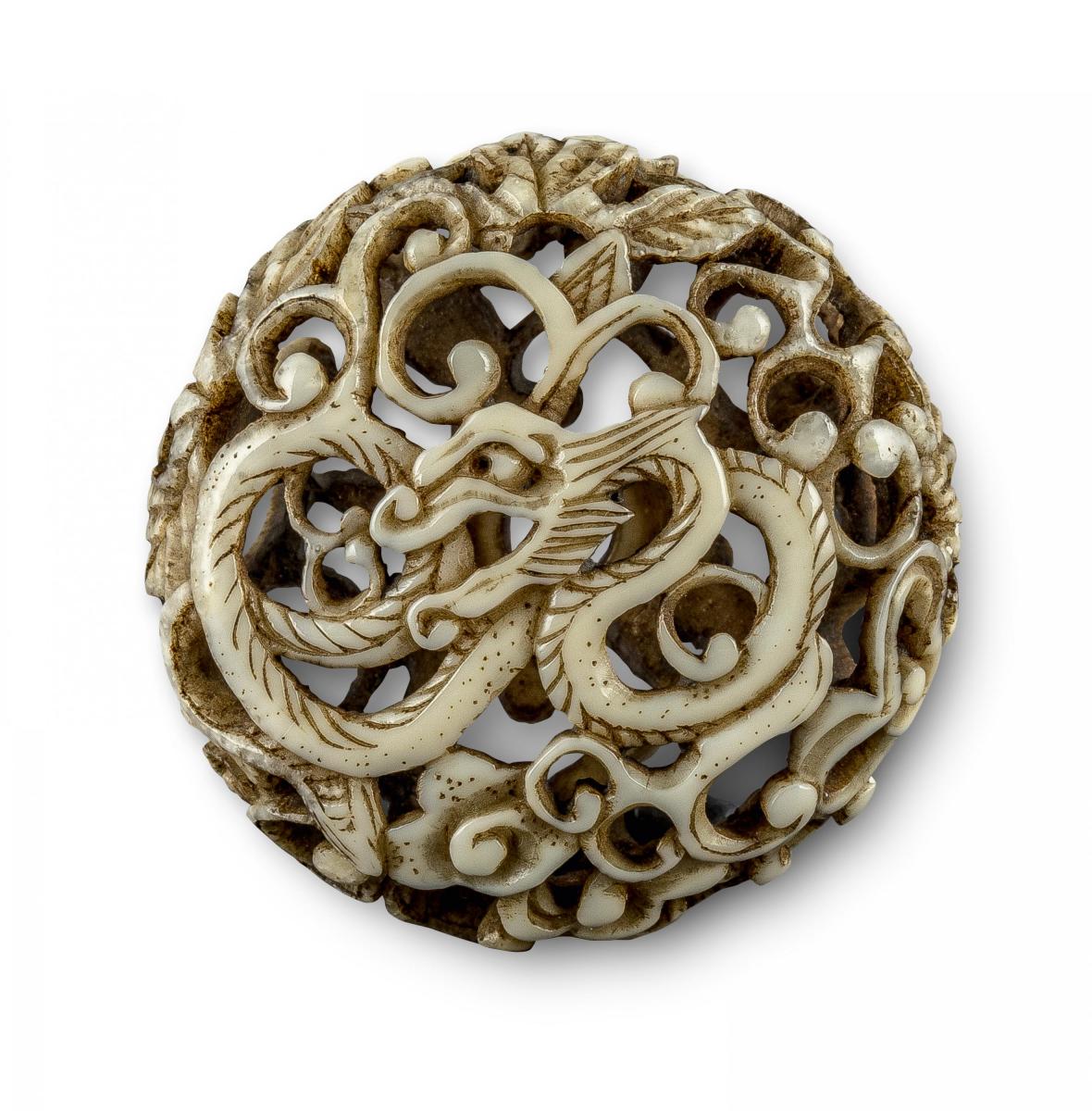 Technik: Vermutlich Walrosszahn, mit fein geschnitzten und gravierten Details, dunkel eingefärbt.