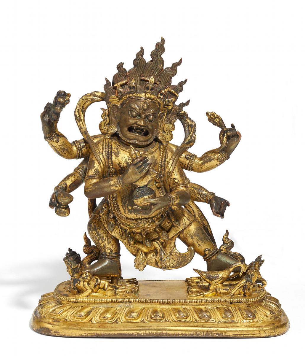 Beschreibung: Der Dharmapala-Wächter hält in seinen sechs Händen die charakteristischen Attribute und