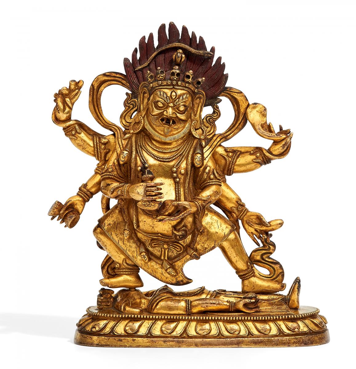 Technik: Bronze mit schwerer Vergoldung und kultischer Bemalung, Boden des Sockels verschlossen.