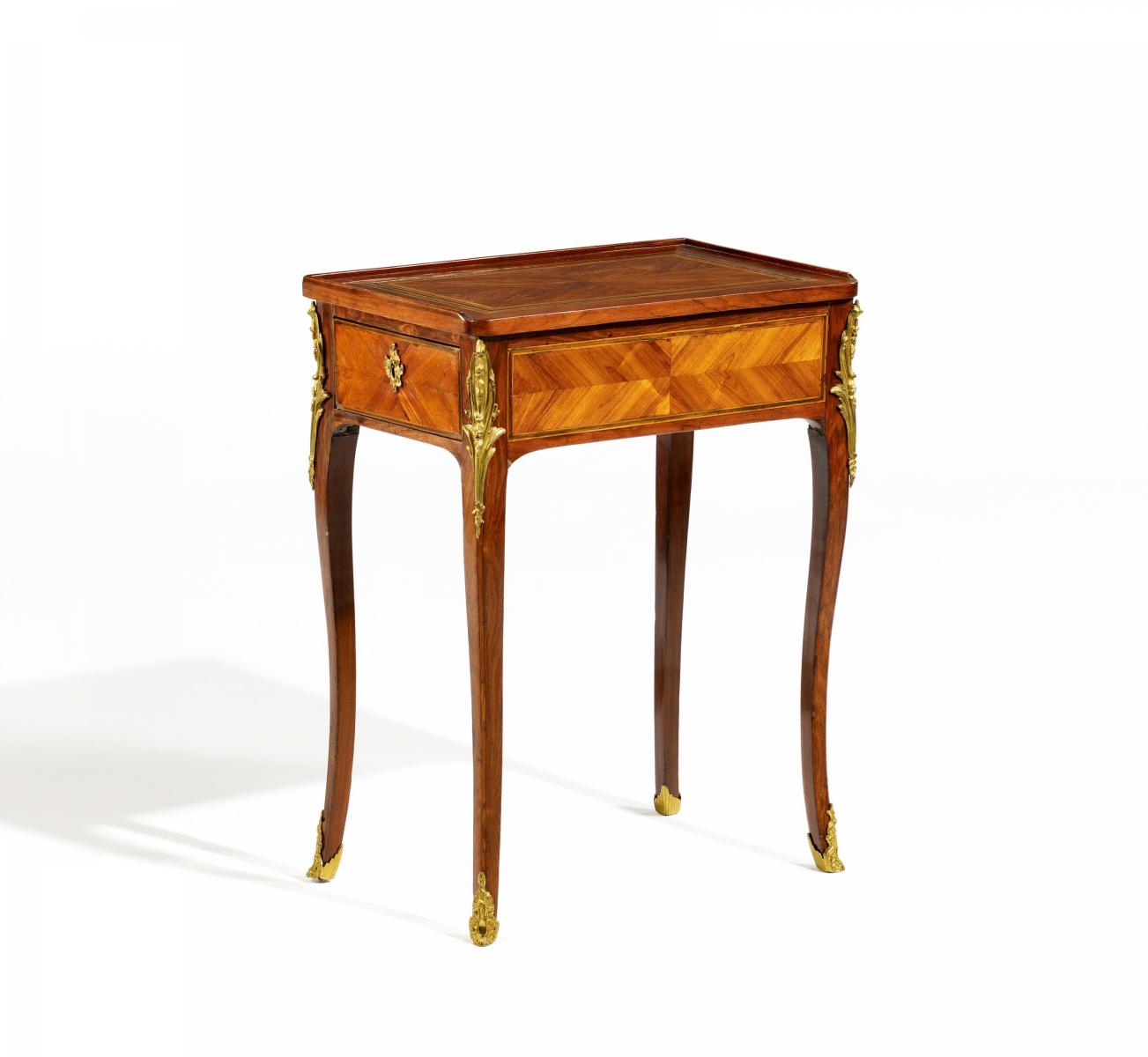 Rosenholz, Ahorn, Mahagoni, Riopalisander. Vergoldete Bronzeapplikationen. Rechteckiger Korpus auf hohen geschweiften Beinen mit zwei seitlichen Schüben. Durch