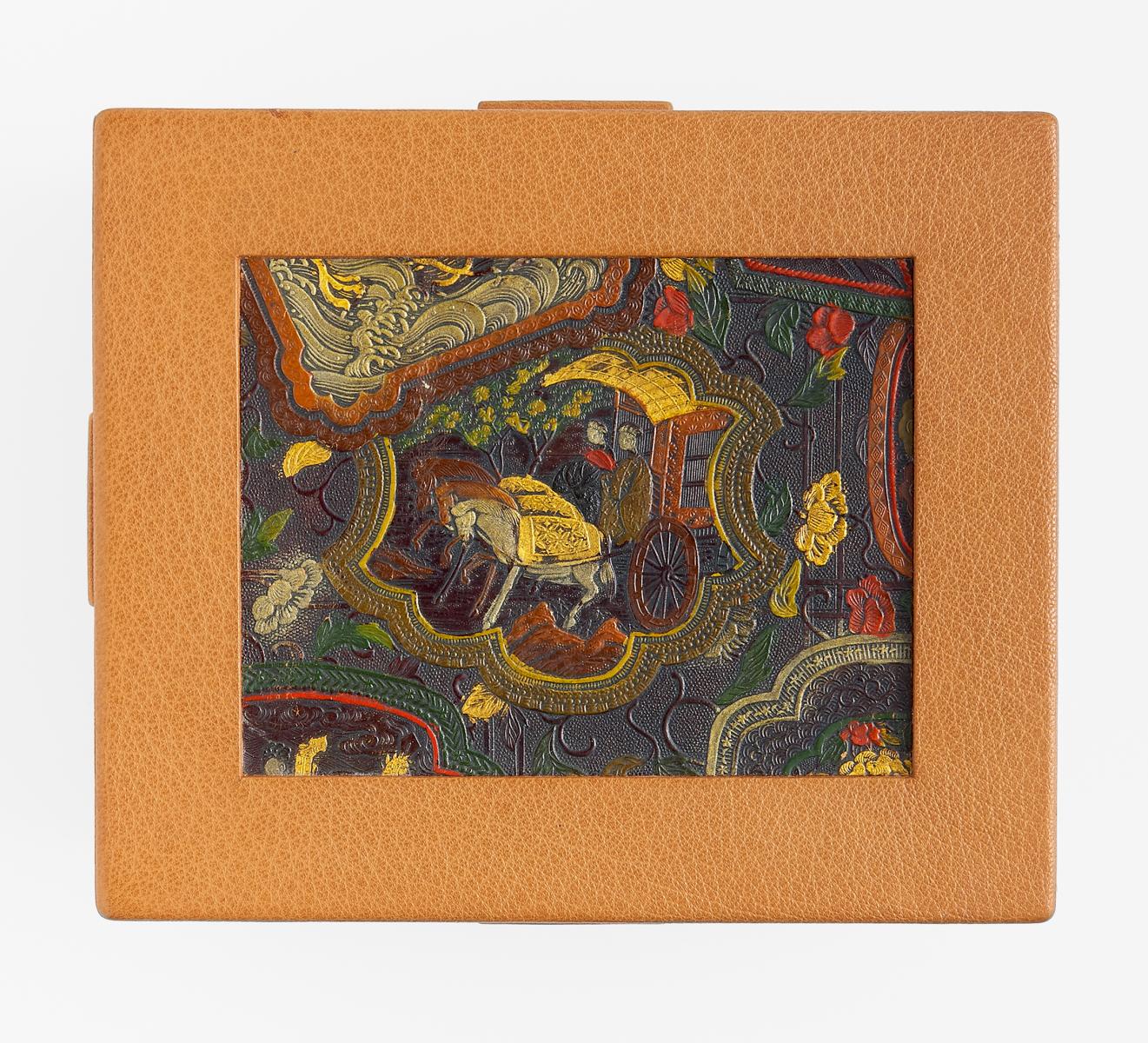 Beschreibung: Für 12 Netsuke in zwei Etagen, beigefarbenes Leder, auf dem Deckel eingelassen ein