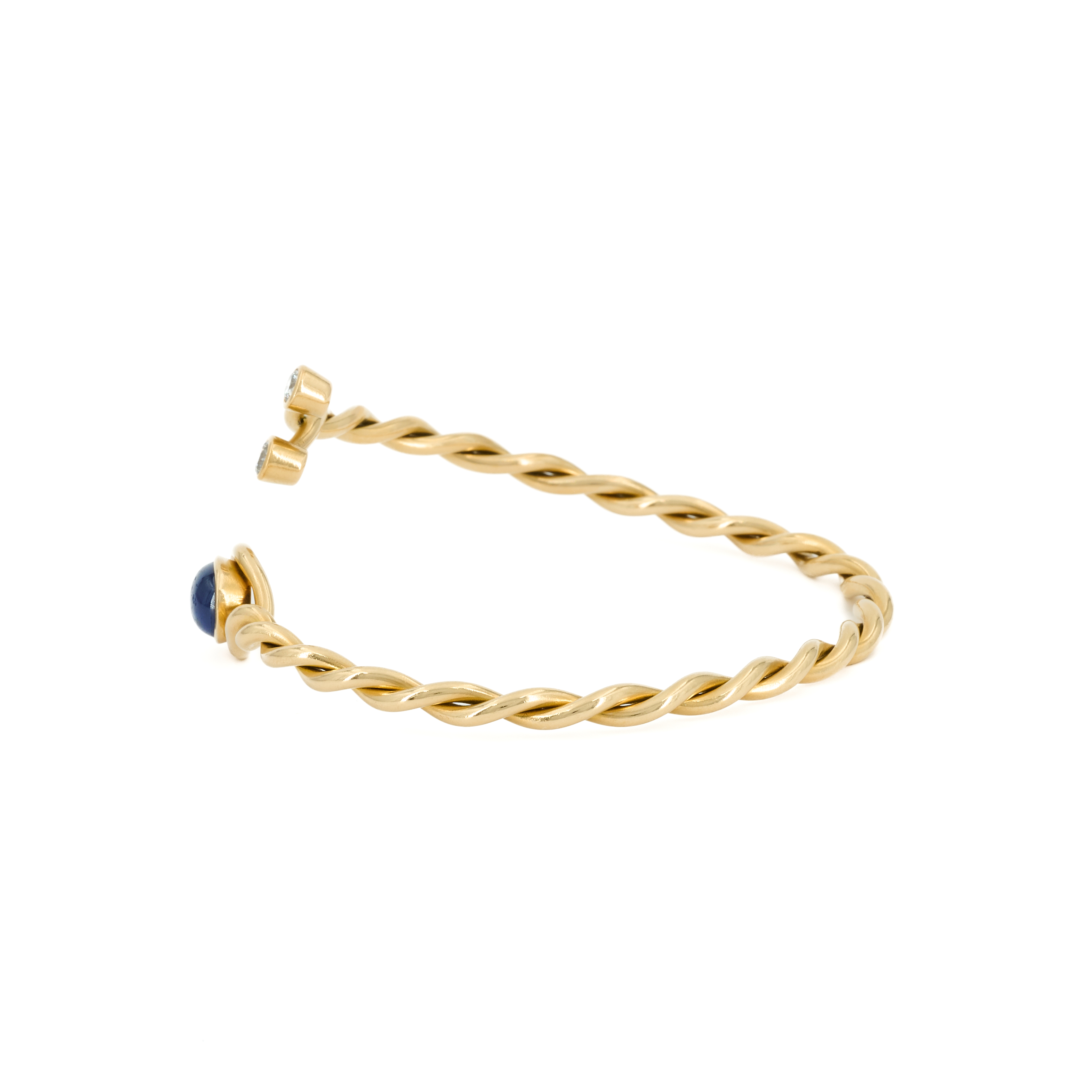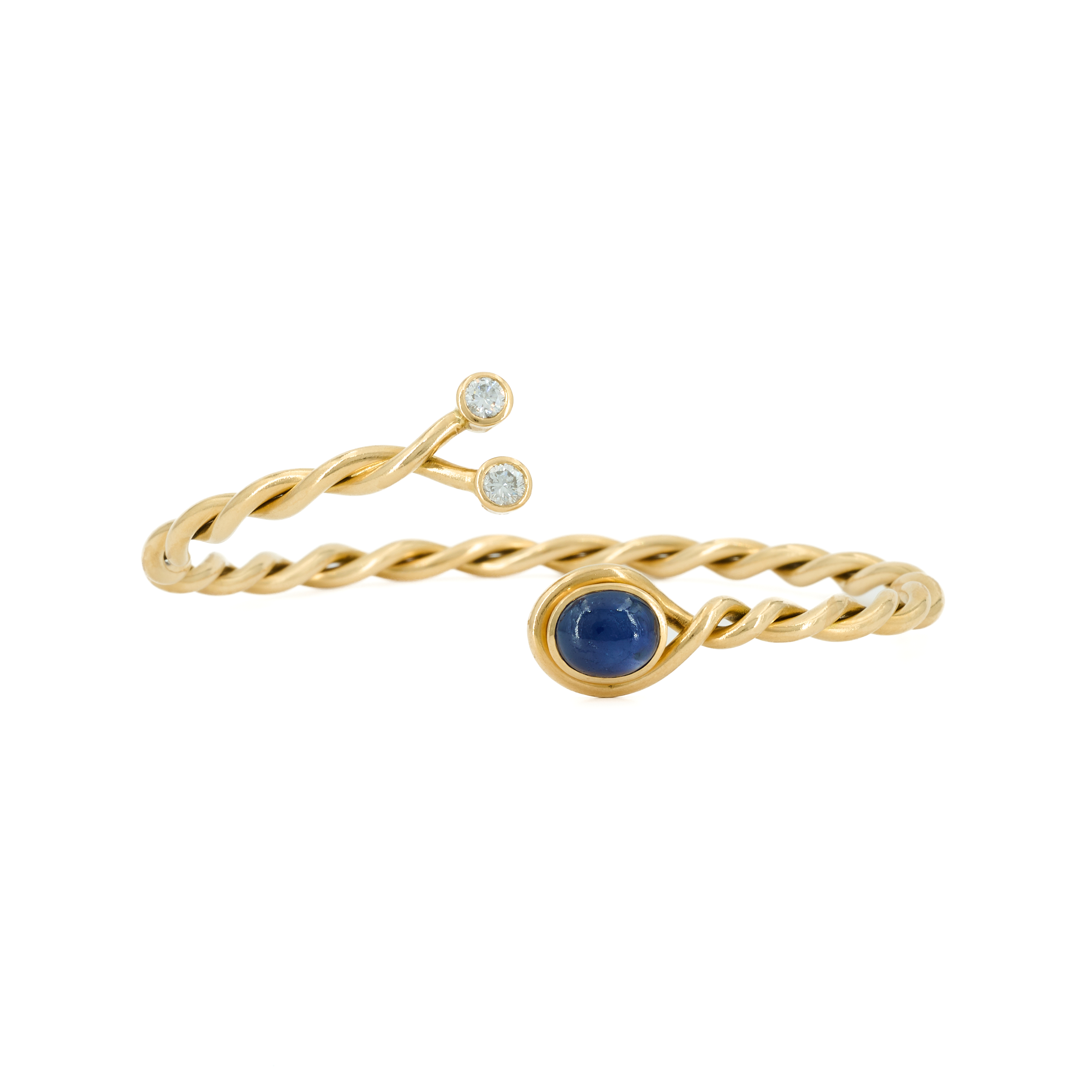 Beschreibung: Gelbgold-Armreif aus gekordeltem Draht, besetzt mit einem ovalen Saphir-Cabochon sowie zwei Diamanten.