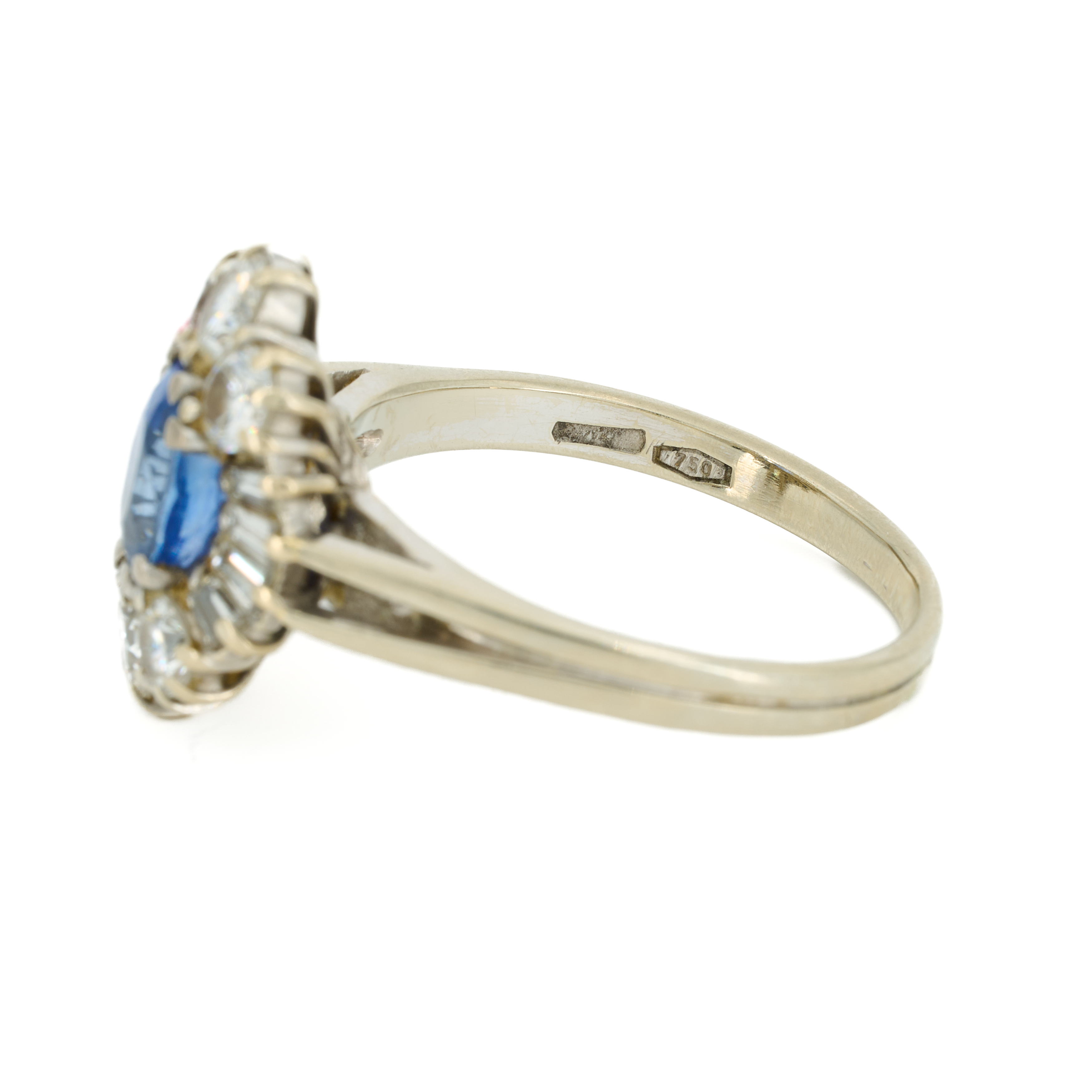 Zustand: Tragespuren in Form leichter bis stärkerer Kratzer sowie kleiner Dellen am Gold. Ringschiene wurde bereits vergrößert. Rhodiumschicht abgetragen. Saphir leicht berieben.