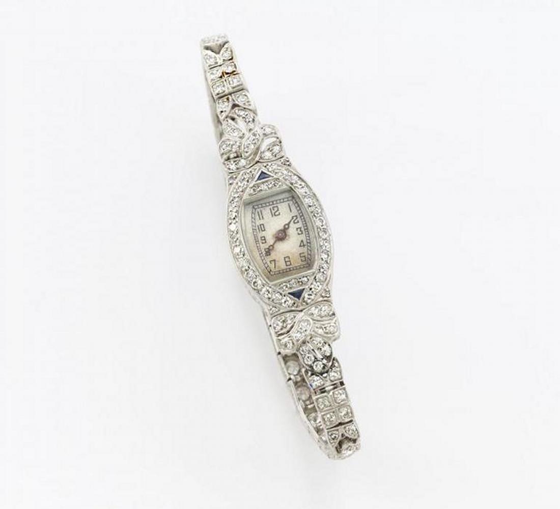 950/- Platin, Gewicht: 27,0g. 2 synthetische Saphir-Triangeln, ca. 98 Diamanten im Alt- und 8/8-Schliff zus.ca. 2,219ct TCr-Cr(I-J) VS-SI, L x B=17,0 x 0,4cm. Diese Uhr wird ausschließlich als Schmuckstück angeboten.