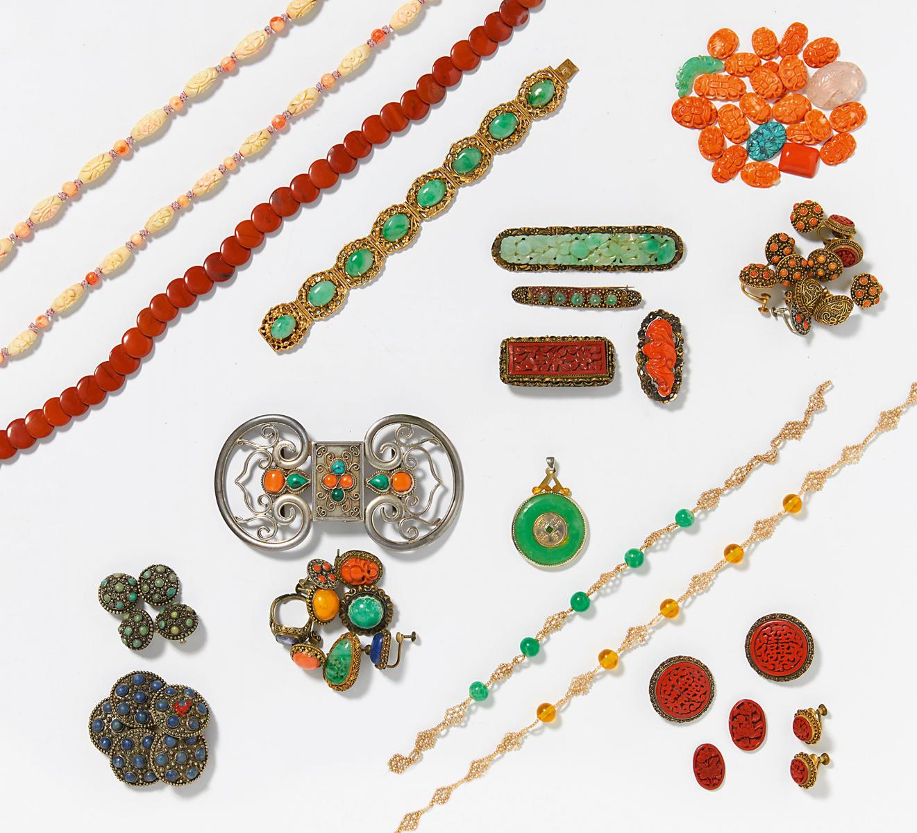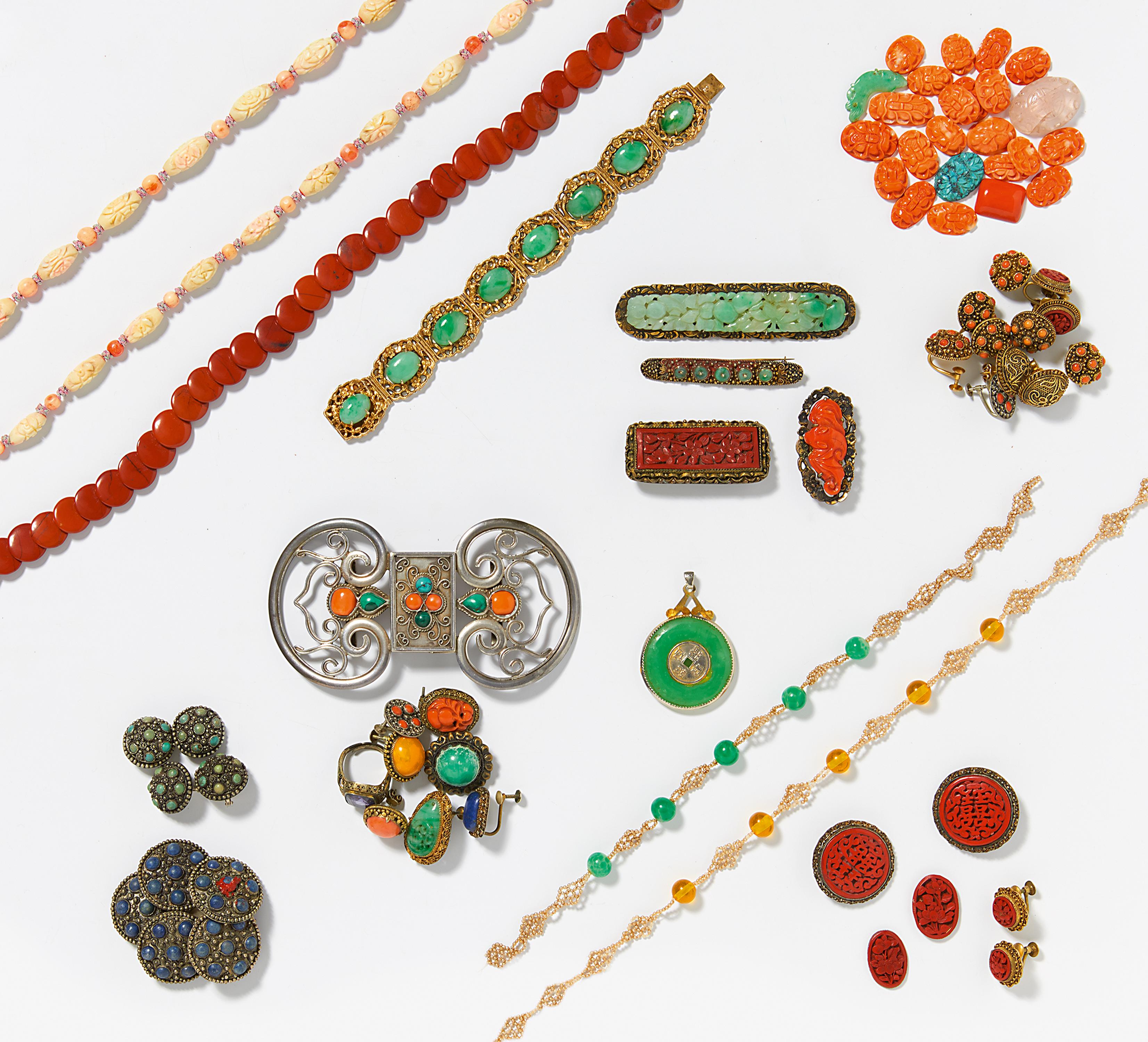 Jade-Anstecker, 1x Schnitzlack-Anstecker, 1x Koralle-Anstecker.