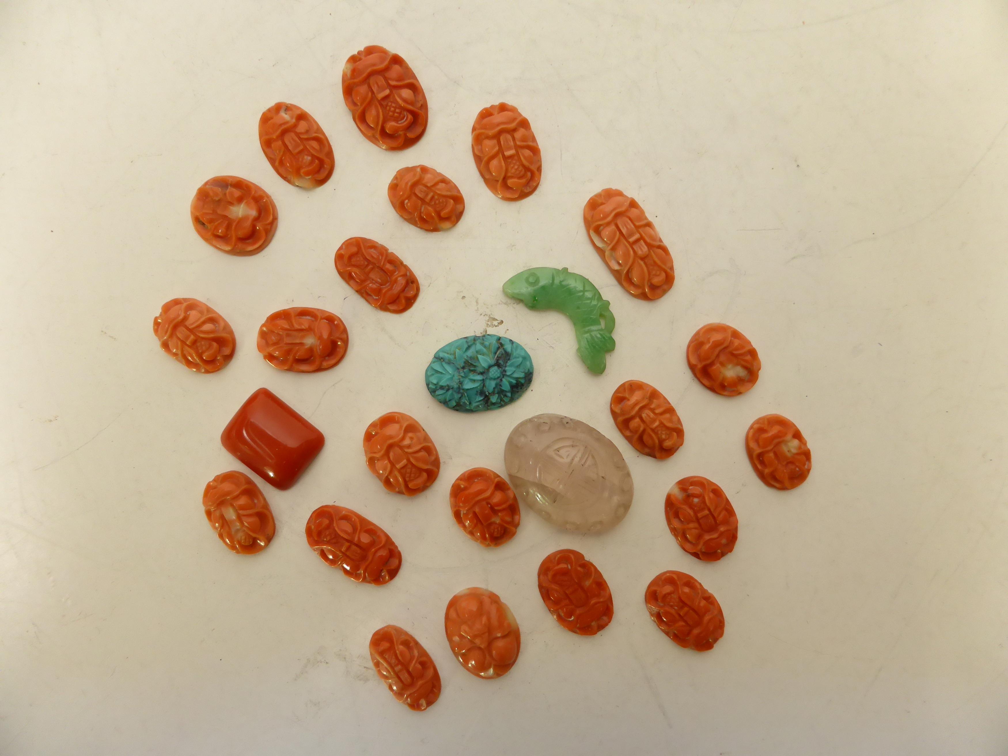 Beschreibung: a) Konvolut kleine in Relief geschnitzte Cabochons: 22 Koralle (1x gebrochen), 1x Türkis,