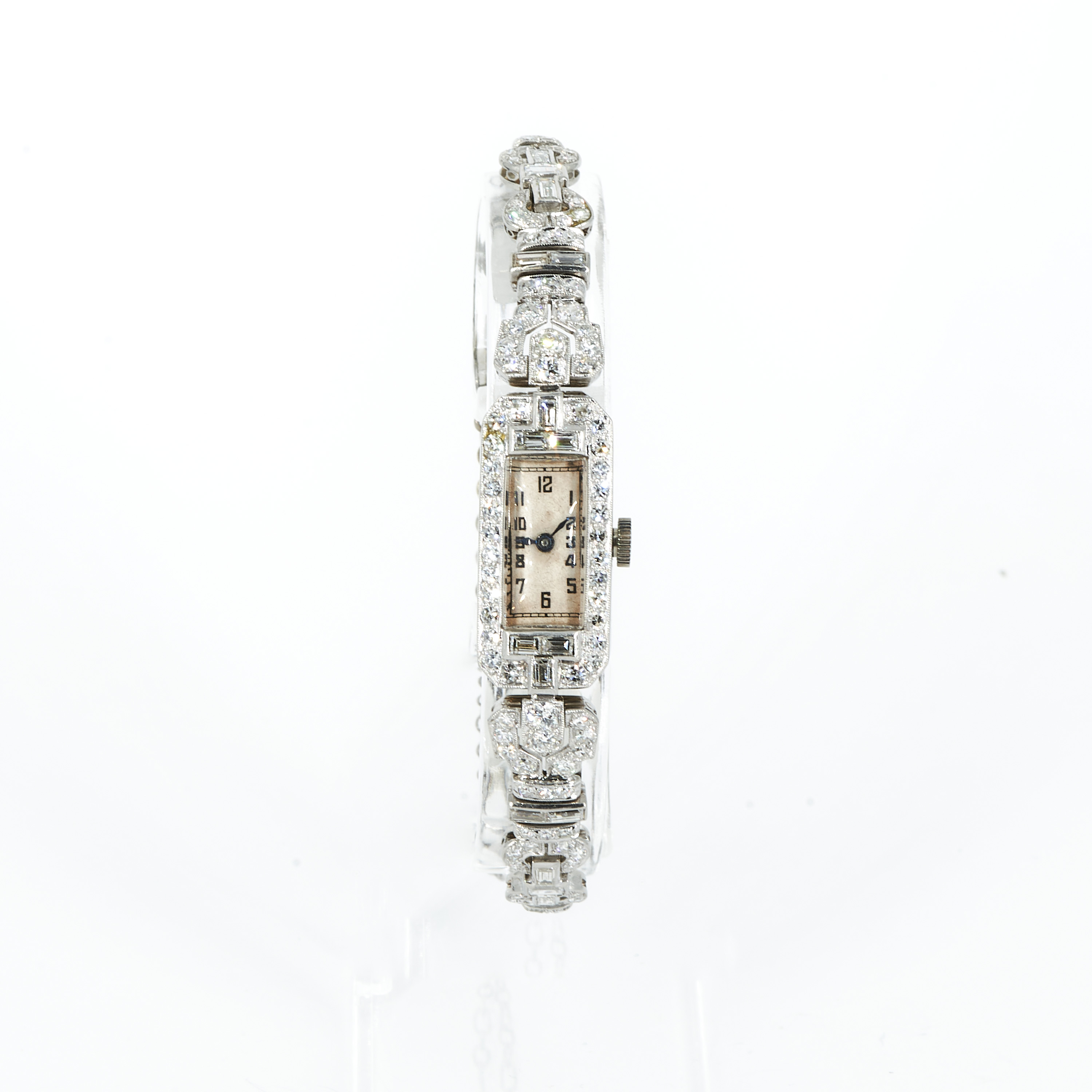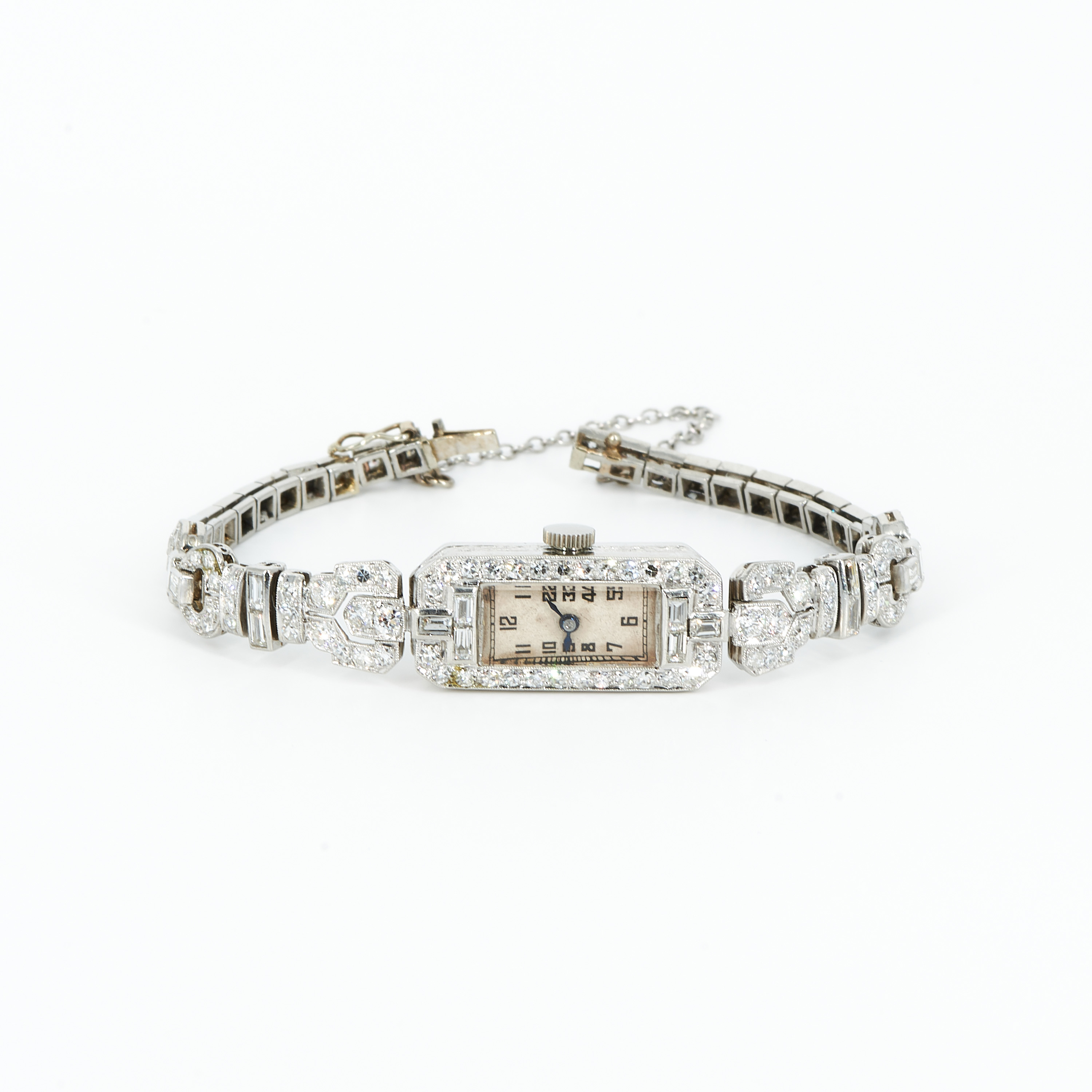 Beschreibung: 2-Zeiger-Schmuckuhr besetzt mit 124 Diamanten im Alt-, Achtkant- und Baguette-Schliff zus.