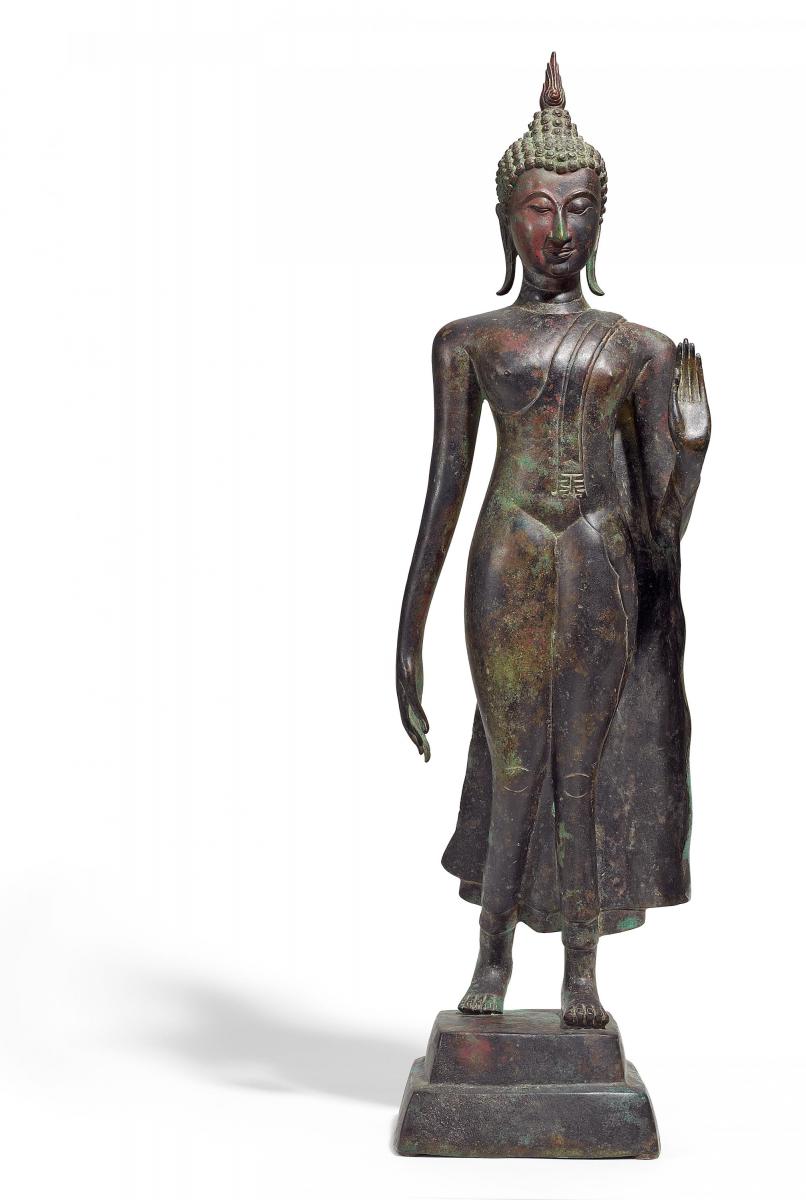 Beschreibung: Auf einem getreppten, quadratischen Sockel. Die Linke zur abhaya mudra erhoben, mit