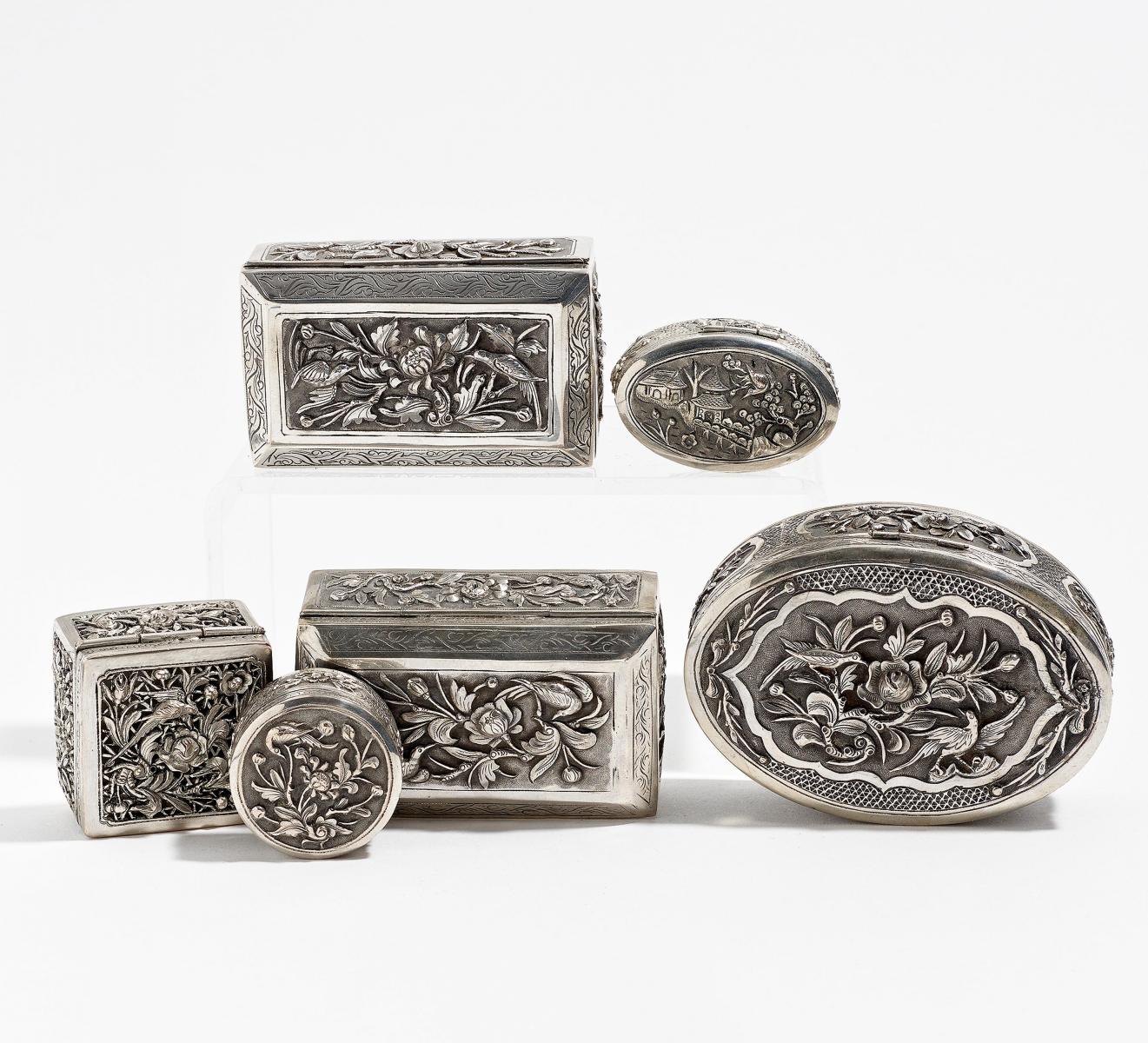Maße: Gesamt 383g. Zwei rechteckig: H.4,2cm, 8,5x5cm. Oval: H.4,4cm, 10,6x7cm. Drei Döschen: H.max.3cm.