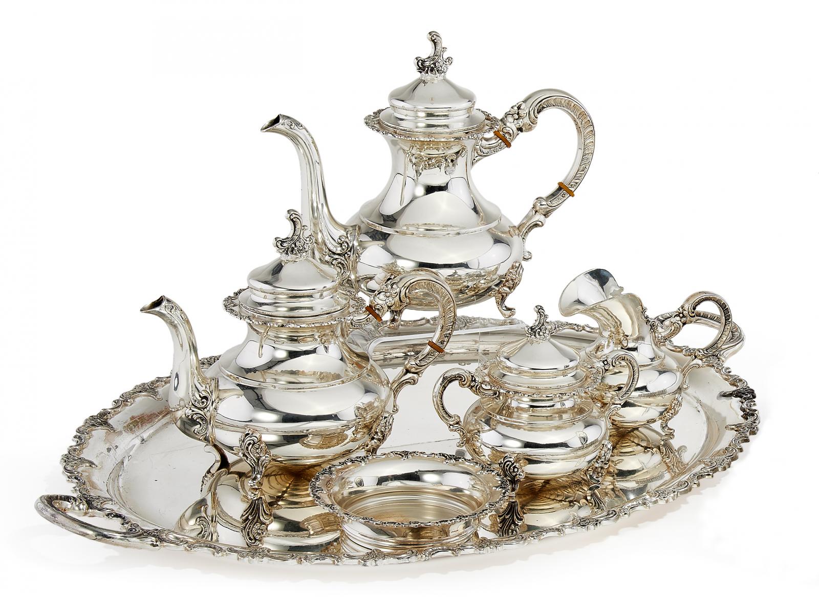 Silber. Bestehend aus Kaffeekanne, Teekanne, Zuckerdose, Milchgießer, Flaschenuntersetzer und